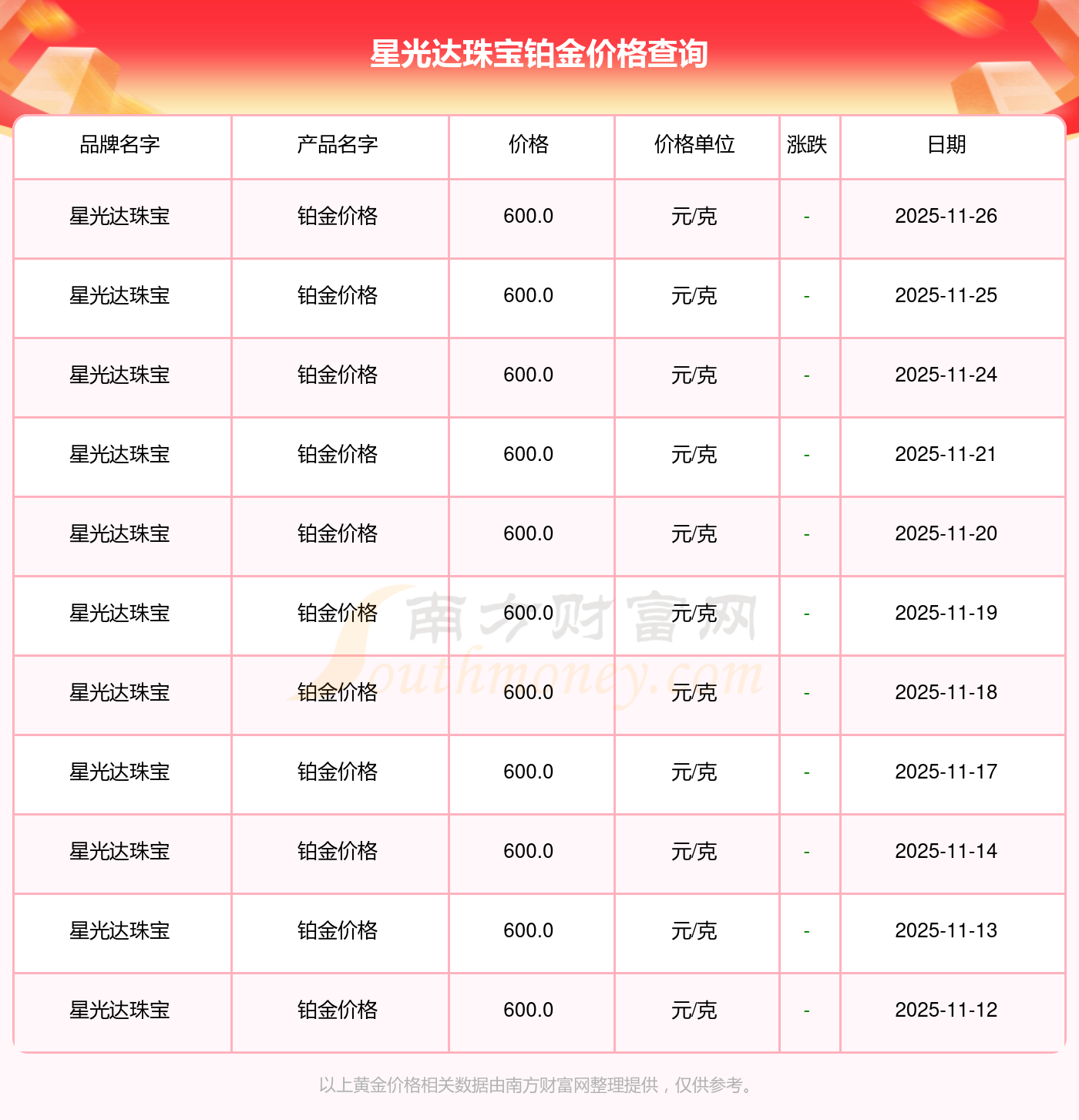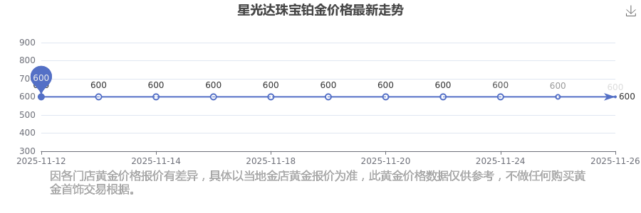 今日星光達珠寶鉑金價格的價格是600.0元/克。