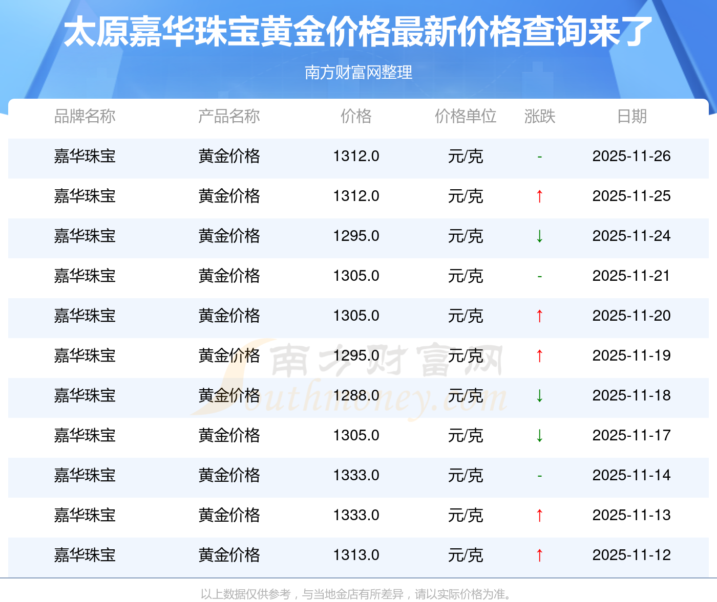 以上數(shù)據(jù)僅供參考,與當(dāng)?shù)仄放粕獭⒔鸬、企業(yè)及銀行營(yíng)業(yè)廳報(bào)價(jià)有所差異,依產(chǎn)品不同需另附工費(fèi),請(qǐng)以實(shí)際報(bào)價(jià)為準(zhǔn)。本站對(duì)價(jià)格等不作任何保證或承諾,請(qǐng)自行核實(shí)相關(guān)內(nèi)容,因此所引起的后果與本站無(wú)關(guān)。