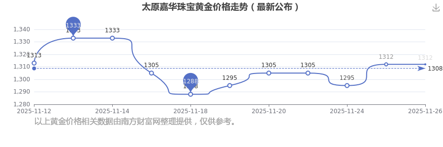 太原嘉華珠寶黃金價(jià)格在 2025年11月26日,其市場(chǎng)價(jià)格為 1312.0元/克。