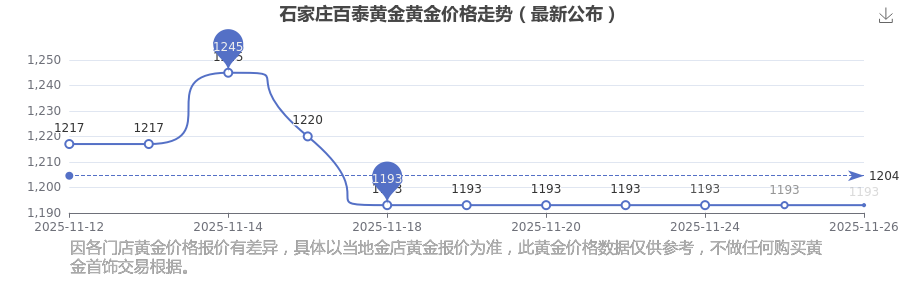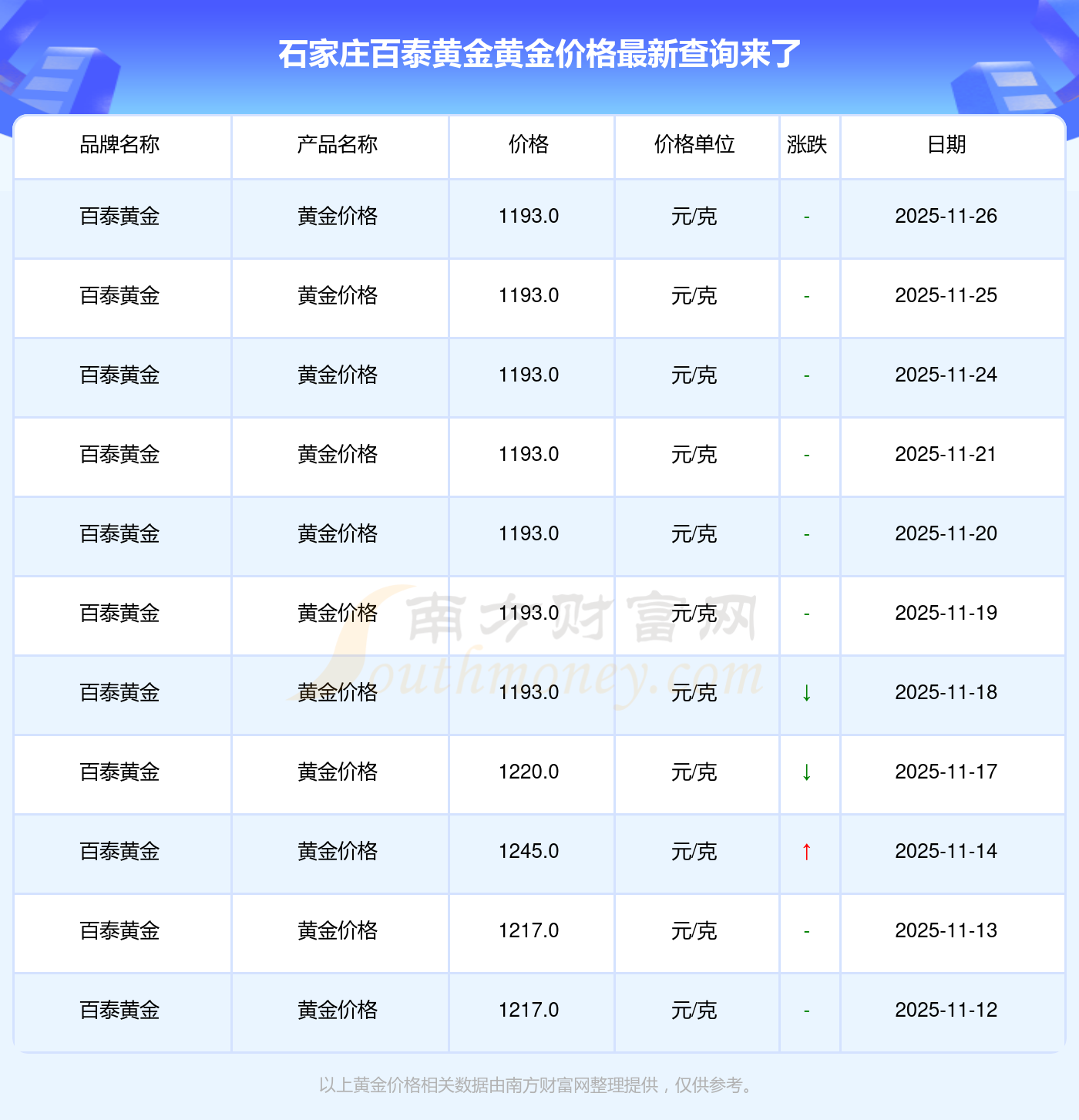 2025年11月26日,石家莊百泰黃金黃金價格每克的價值量定格在1193.0元/克。