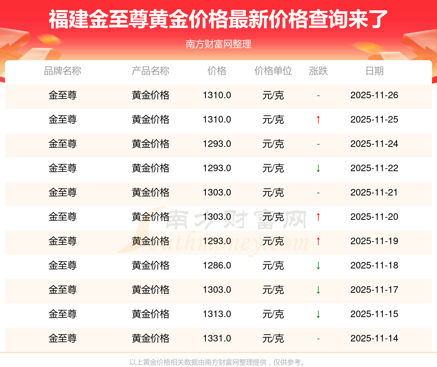 福建金至尊在 2025年11月26日的黃金價格零售價格為 1310.0元/克。