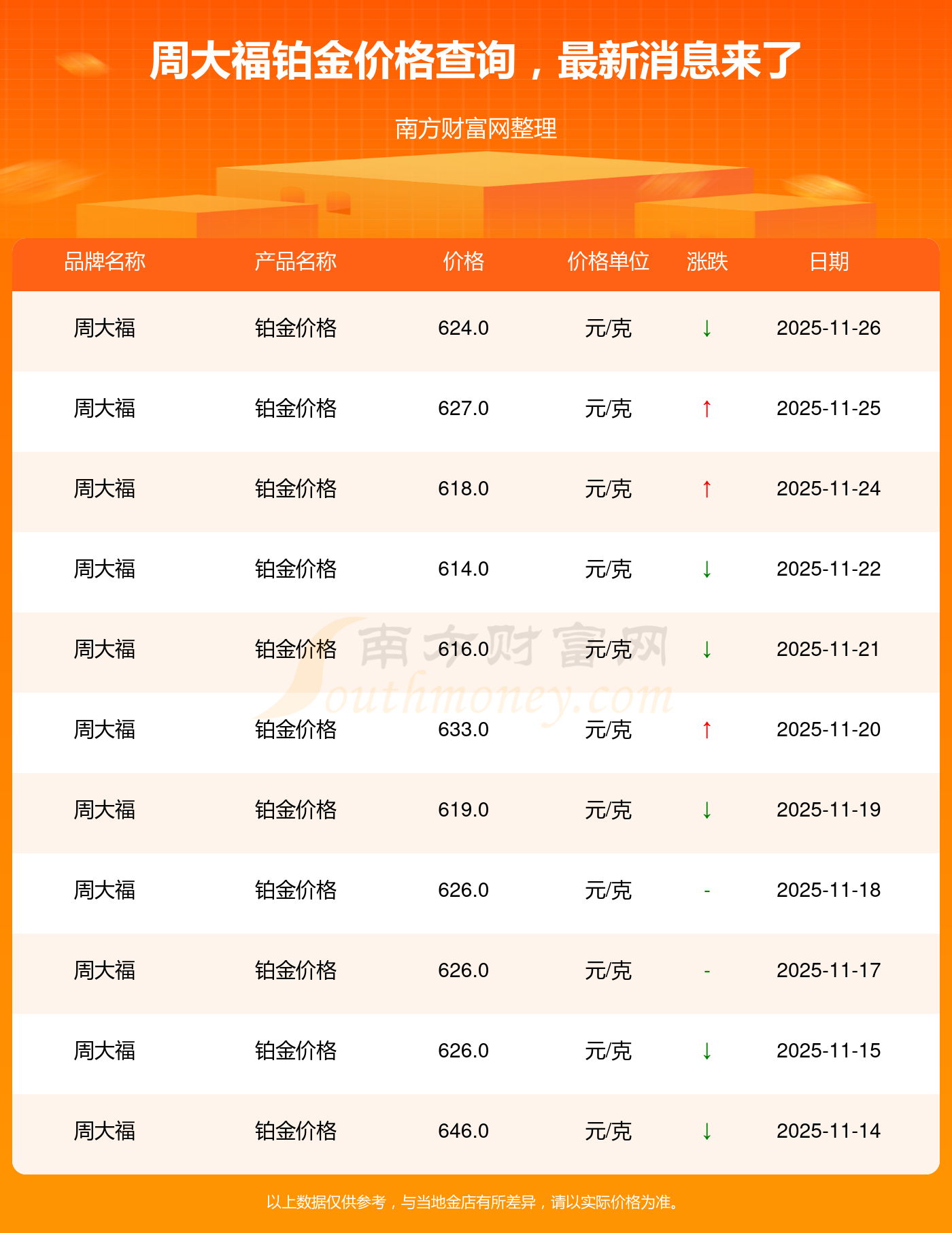 2025年11月26日周大福鉑金價格最新為624.0元/克。