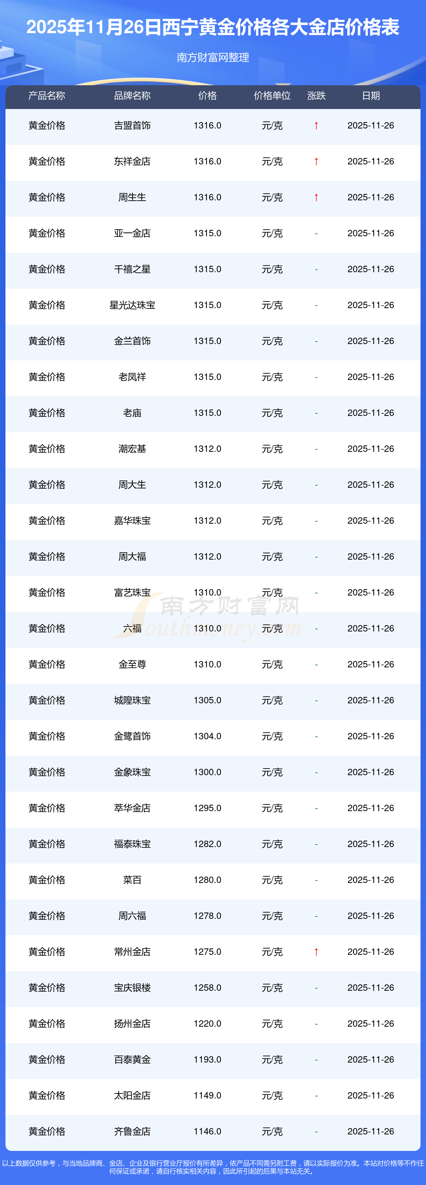2025年11月26日西寧周生生、潮宏基、潮宏基、周大生、周大生、亞一金店、亞一金店、寶慶銀樓、寶慶銀樓、太陽金店、太陽金店等各大金店品牌黃金價格最新價格如下:周生生金條金價(內地)1155.0元/克,潮宏基黃金價格1312.0元/克,潮宏基鉑金價格624.0元/克,周大生黃金價格1312.0元/克,周大生鉑金價格624.0元/克,亞一金店黃金價格1315.0元/克,亞一金店鉑金價格600.0元/克,寶慶銀樓黃金價格1258.0元/克,寶慶銀樓鉑金價格368.0元/克,太陽金店黃金價格1149.0元/克,太陽金店鉑金價格489.0元/克。
