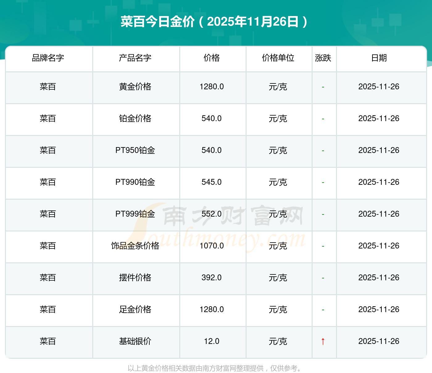 2025年11月26日周生生、潮宏基、潮宏基、周大生、周大生、亞一金店、亞一金店、寶慶銀樓、寶慶銀樓、太陽(yáng)金店、太陽(yáng)金店等各大金店品牌足金價(jià)格最新價(jià)格如下:周生生金條金價(jià)(內(nèi)地)1155.0元/克,潮宏基黃金價(jià)格1312.0元/克,潮宏基鉑金價(jià)格624.0元/克,周大生黃金價(jià)格1312.0元/克,周大生鉑金價(jià)格624.0元/克,亞一金店黃金價(jià)格1315.0元/克,亞一金店鉑金價(jià)格600.0元/克,寶慶銀樓黃金價(jià)格1258.0元/克,寶慶銀樓鉑金價(jià)格368.0元/克,太陽(yáng)金店黃金價(jià)格1149.0元/克,太陽(yáng)金店鉑金價(jià)格489.0元/克。