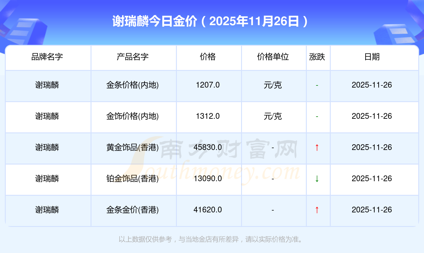 2025年11月26日謝瑞麟今日價(jià)格:金條金價(jià)(內(nèi)地)1155.0元/克,黃金價(jià)格1312.0元/克,鉑金價(jià)格624.0元/克,黃金價(jià)格1312.0元/克,鉑金價(jià)格624.0元/克,黃金價(jià)格1315.0元/克,鉑金價(jià)格600.0元/克,黃金價(jià)格1258.0元/克,鉑金價(jià)格368.0元/克,黃金價(jià)格1149.0元/克,鉑金價(jià)格489.0元/克。
