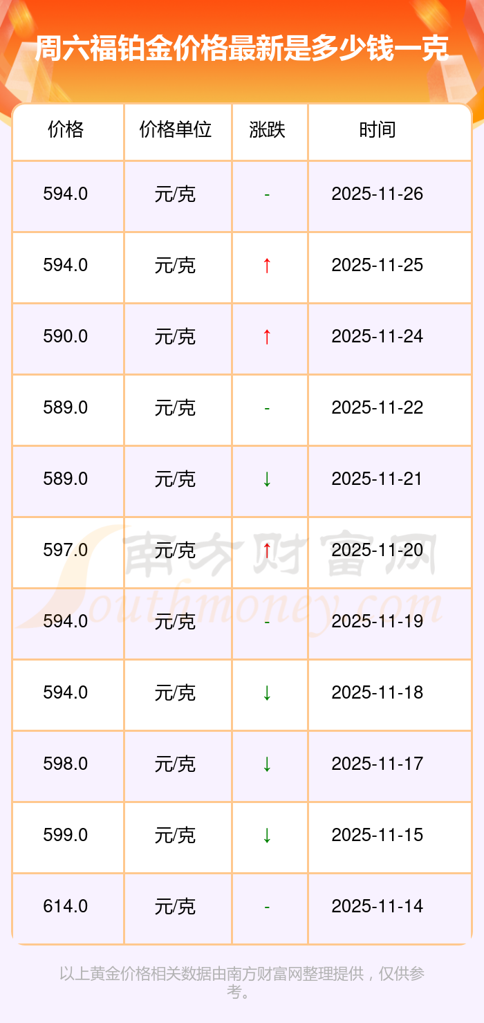 2025年11月26日周六福鉑金價格:594.0元/克。