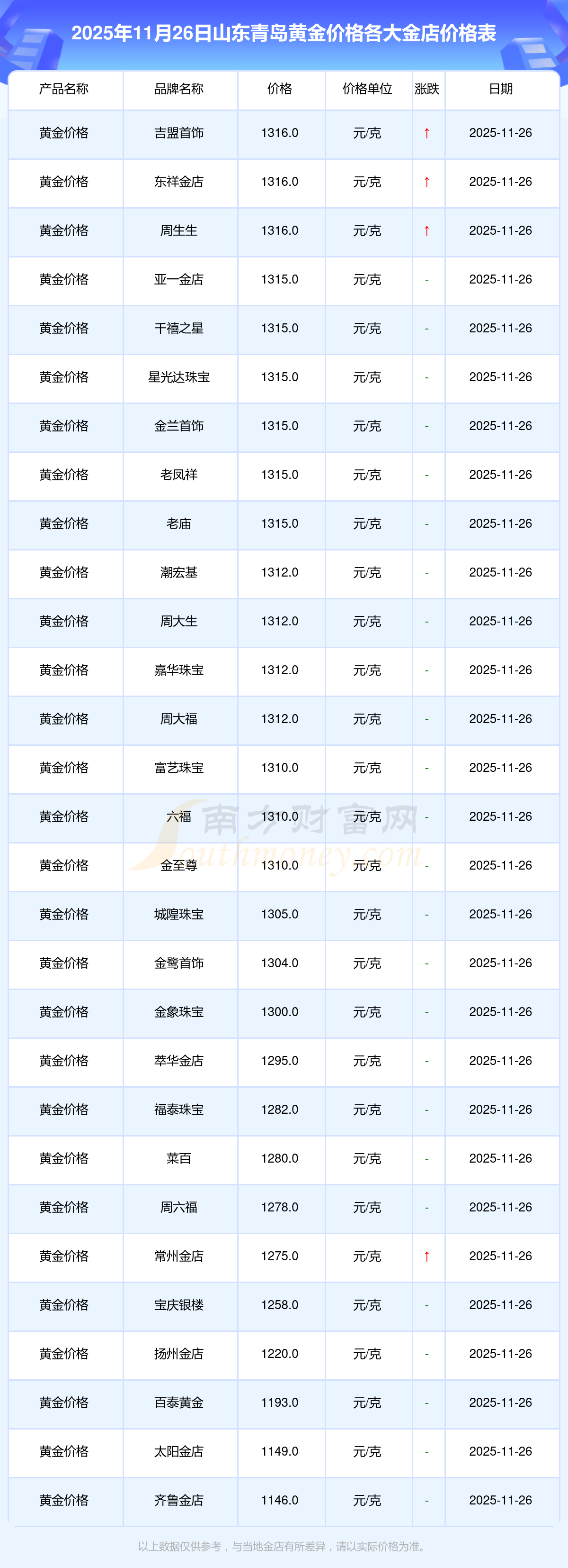 2025年11月26日山東青島周生生、潮宏基、潮宏基、周大生、周大生、亞一金店、亞一金店、寶慶銀樓、寶慶銀樓、太陽金店、太陽金店等各大金店品牌黃金價(jià)格最新價(jià)格行情來了,如下:周生生金條金價(jià)(內(nèi)地)1155.0元/克,潮宏基黃金價(jià)格1312.0元/克,潮宏基鉑金價(jià)格624.0元/克,周大生黃金價(jià)格1312.0元/克,周大生鉑金價(jià)格624.0元/克,亞一金店黃金價(jià)格1315.0元/克,亞一金店鉑金價(jià)格600.0元/克,寶慶銀樓黃金價(jià)格1258.0元/克,寶慶銀樓鉑金價(jià)格368.0元/克,太陽金店黃金價(jià)格1149.0元/克,太陽金店鉑金價(jià)格489.0元/克。