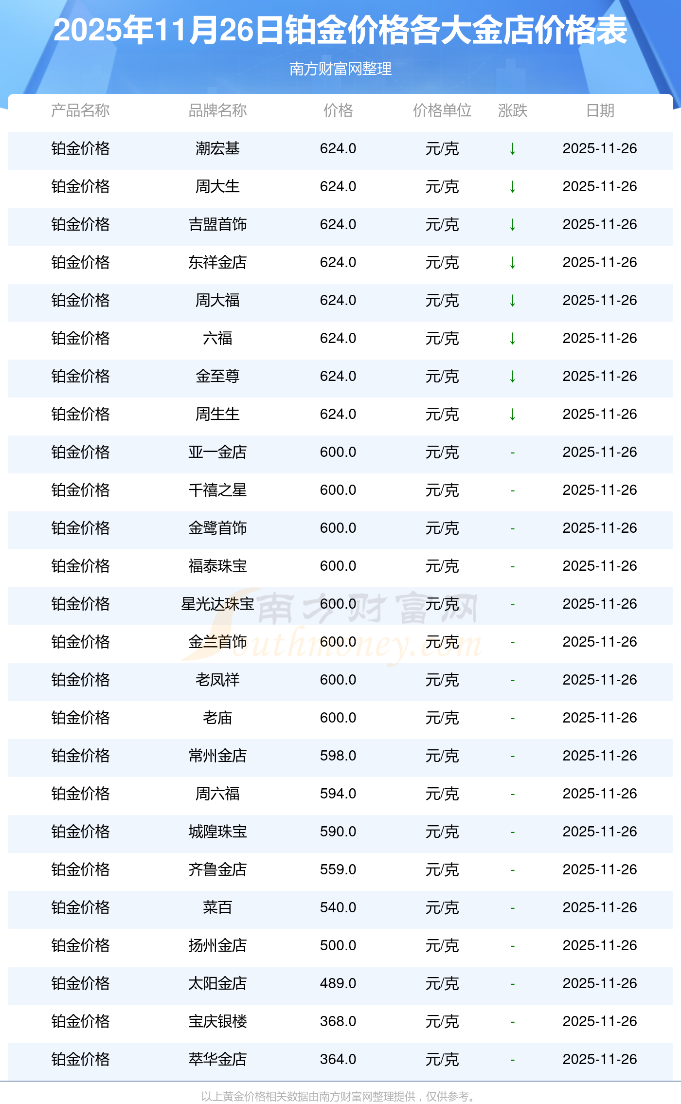 2025年11月26日,周生生、潮宏基、潮宏基、周大生、周大生、亞一金店、亞一金店、寶慶銀樓、寶慶銀樓、太陽金店、太陽金店等各大金店品牌鉑金價格今日價格如下:周生生1155.0元/克、潮宏基1312.0元/克、潮宏基624.0元/克、周大生1312.0元/克、周大生624.0元/克、亞一金店1315.0元/克、亞一金店600.0元/克、寶慶銀樓1258.0元/克、寶慶銀樓368.0元/克、太陽金店1149.0元/克、太陽金店489.0元/克。