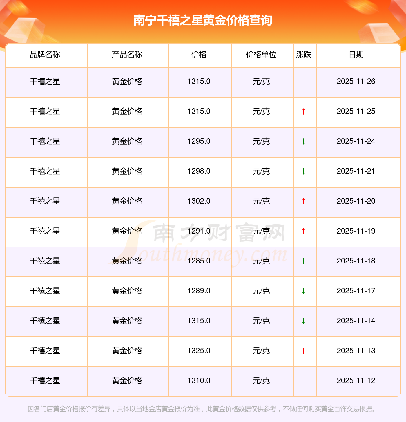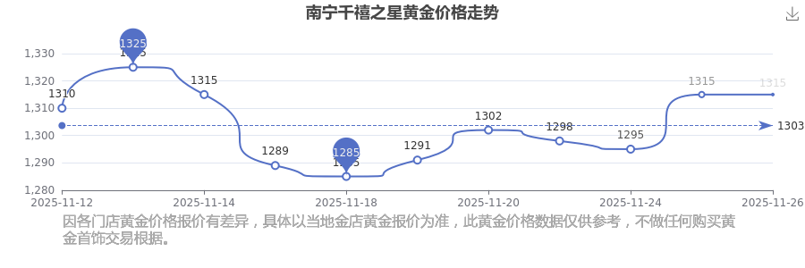 2025年11月26日當(dāng)天,南寧千禧之星黃金價(jià)格的單價(jià)是 1315.0元/克。