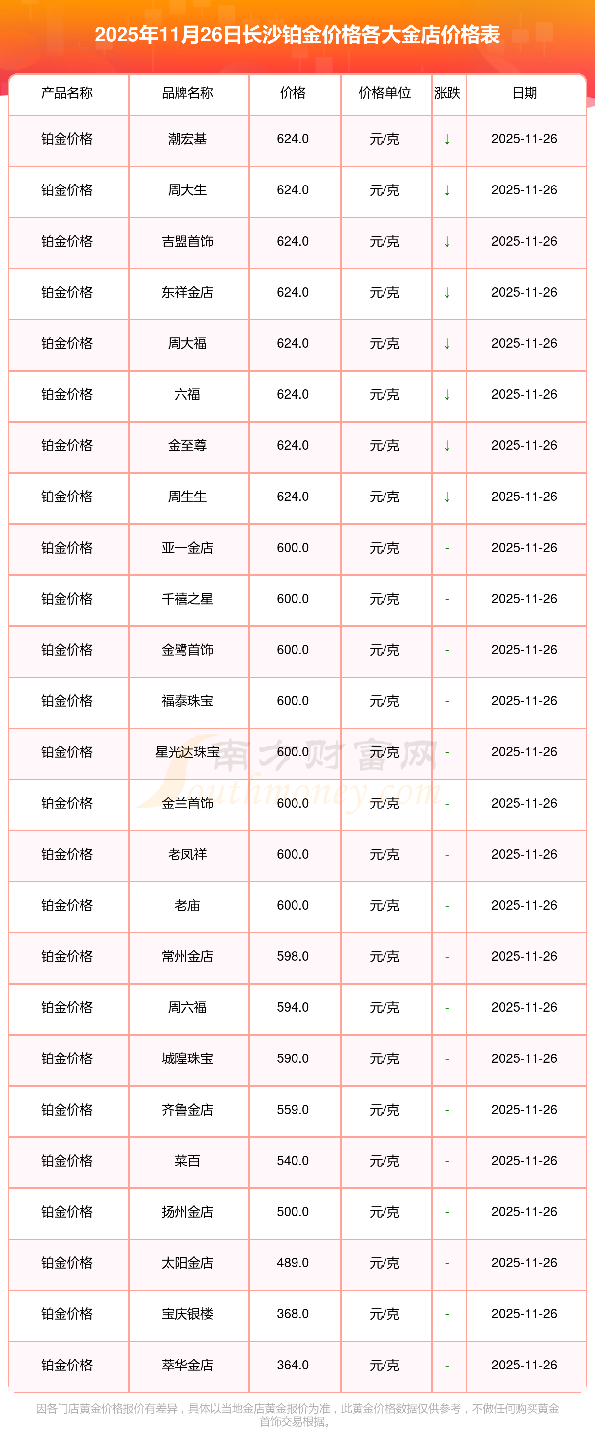 今天是2025年11月26日,長沙周生生、潮宏基、潮宏基、周大生、周大生、亞一金店、亞一金店、寶慶銀樓、寶慶銀樓、太陽金店、太陽金店等各大金店品牌鉑金價(jià)格最新價(jià)格如下:周生生1155.0元/克、潮宏基1312.0元/克、潮宏基624.0元/克、周大生1312.0元/克、周大生624.0元/克、亞一金店1315.0元/克、亞一金店600.0元/克、寶慶銀樓1258.0元/克、寶慶銀樓368.0元/克、太陽金店1149.0元/克、太陽金店489.0元/克。