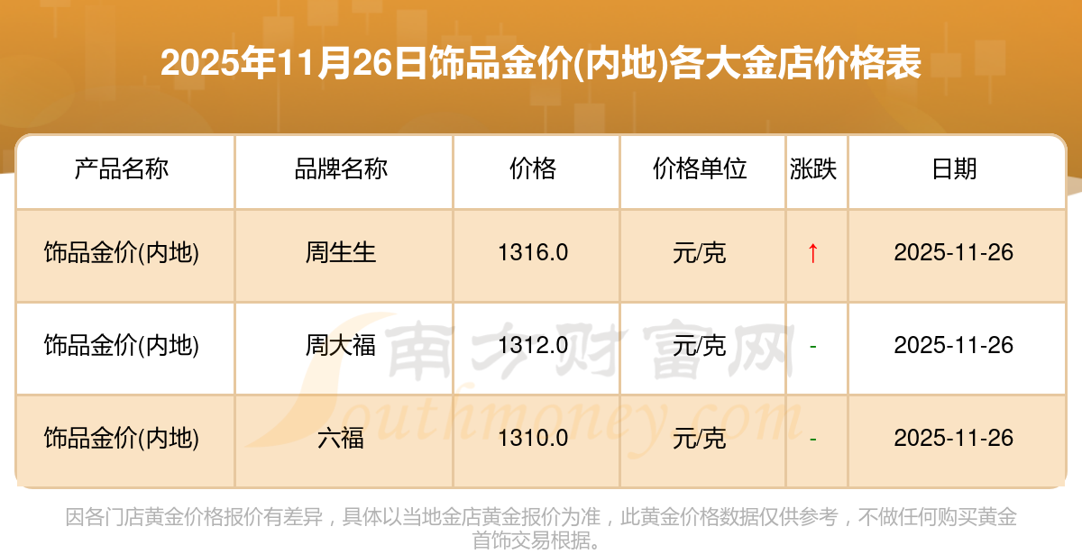 2025年11月26日,周生生、潮宏基、潮宏基、周大生、周大生、亞一金店、亞一金店、寶慶銀樓、寶慶銀樓、太陽金店、太陽金店等各大金店品牌飾品金價(jià)(內(nèi)地)今日價(jià)格如下:周生生1155.0元/克、潮宏基1312.0元/克、潮宏基624.0元/克、周大生1312.0元/克、周大生624.0元/克、亞一金店1315.0元/克、亞一金店600.0元/克、寶慶銀樓1258.0元/克、寶慶銀樓368.0元/克、太陽金店1149.0元/克、太陽金店489.0元/克。