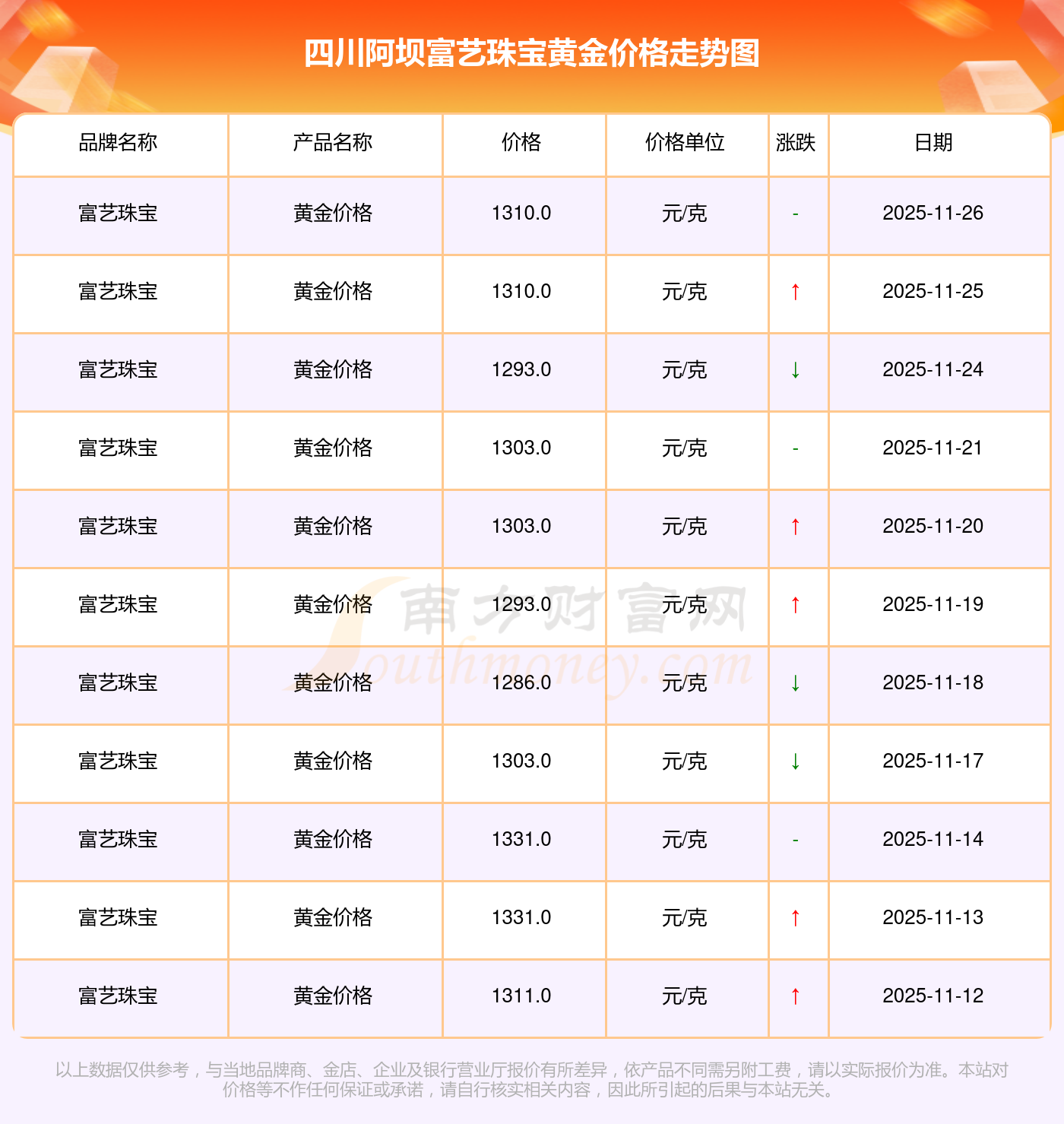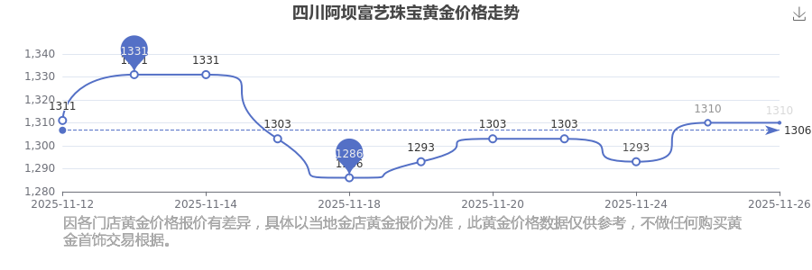 四川阿壩富藝珠寶今日黃金價格每克多少錢?此刻一克黃金的售賣價是多少?今日四川阿壩富藝珠寶黃金價格查詢,今日(2025年11月26日),1310.0元/克是四川阿壩富藝珠寶黃金價格的價格標(biāo)準(zhǔn)。
