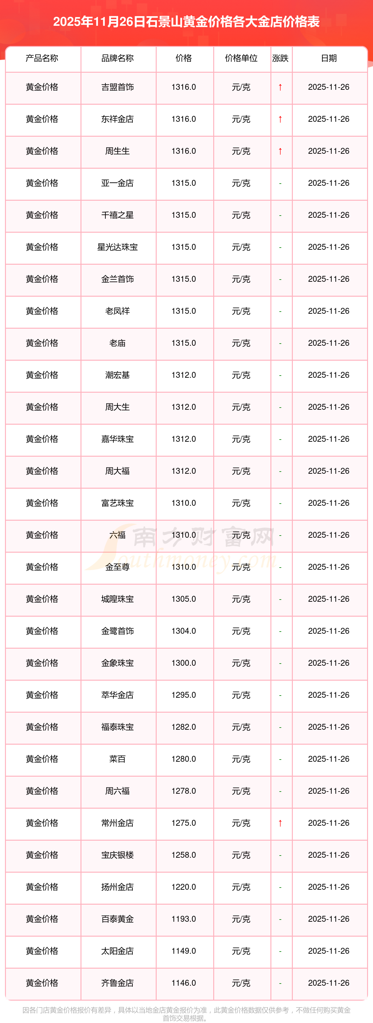 2025年11月26日,石景山周生生、潮宏基、潮宏基、周大生、周大生、亞一金店、亞一金店、寶慶銀樓、寶慶銀樓、太陽金店、太陽金店等各大金店品牌黃金價格今日價格行情最新來了:周生生1155.0元/克、潮宏基1312.0元/克、潮宏基624.0元/克、周大生1312.0元/克、周大生624.0元/克、亞一金店1315.0元/克、亞一金店600.0元/克、寶慶銀樓1258.0元/克、寶慶銀樓368.0元/克、太陽金店1149.0元/克、太陽金店489.0元/克。