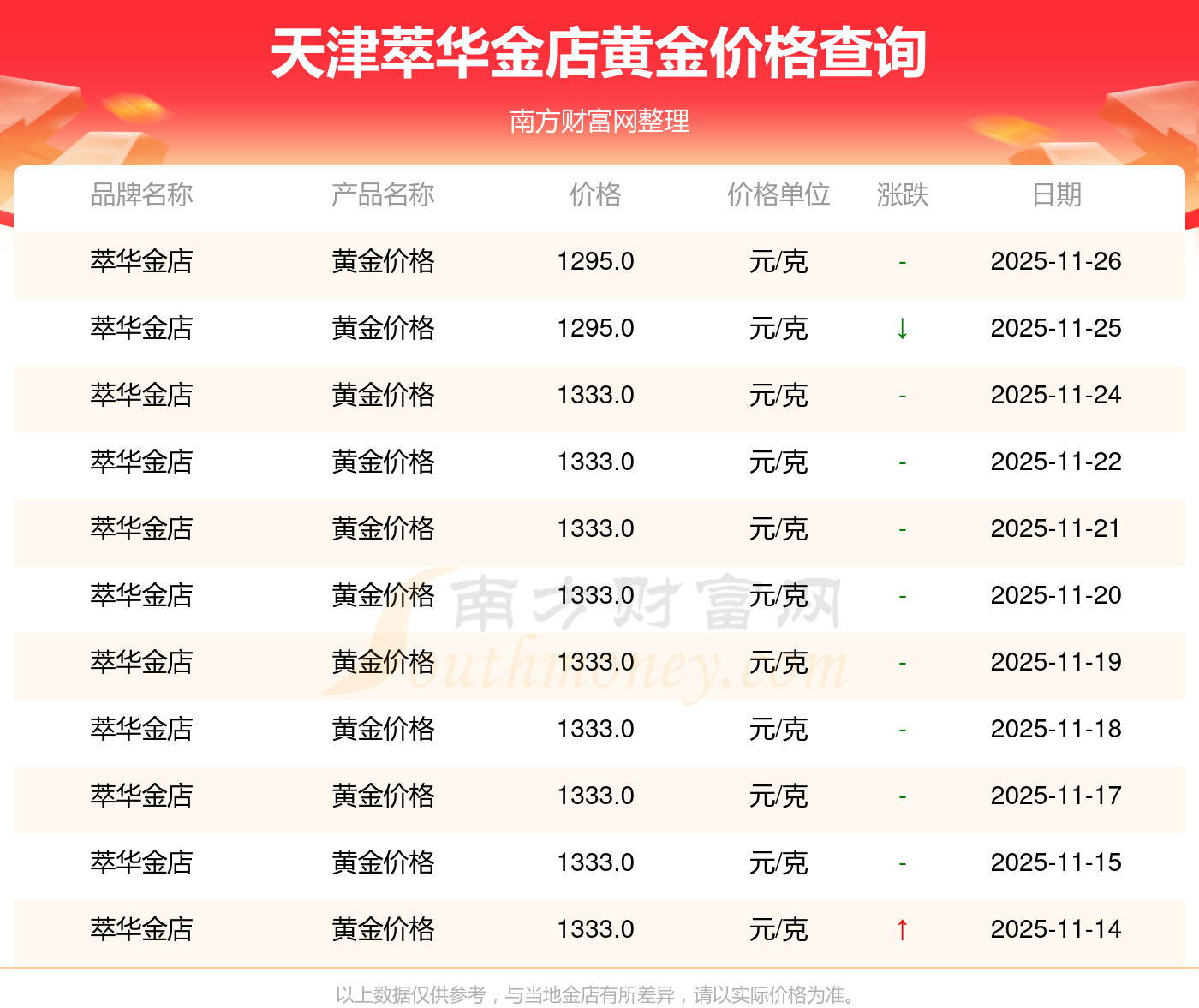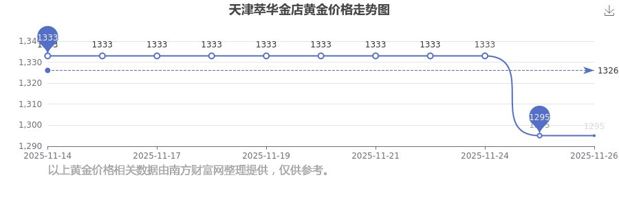 今日2025年11月26日,天津萃華金店黃金價(jià)格為1295.0元/克。
