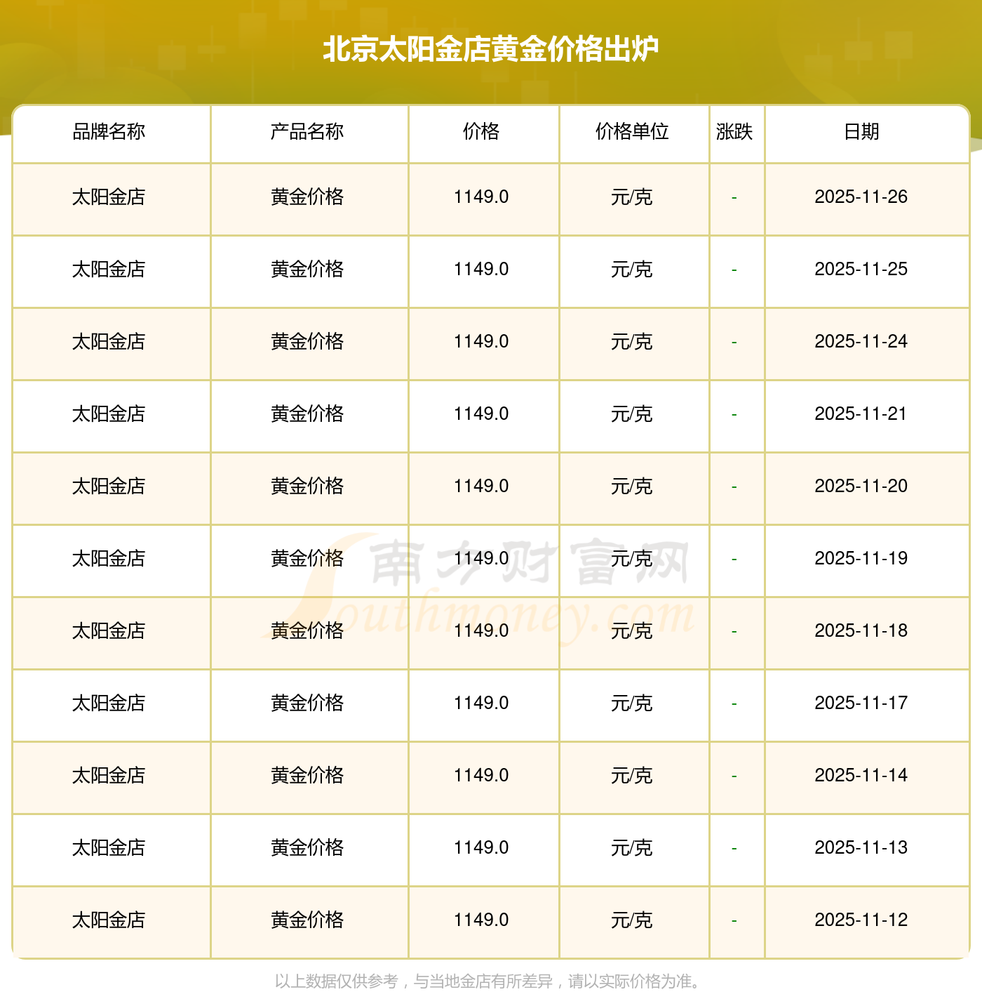2025年11月26日,今日北京太陽金店黃金價(jià)格:1149.0元/克。