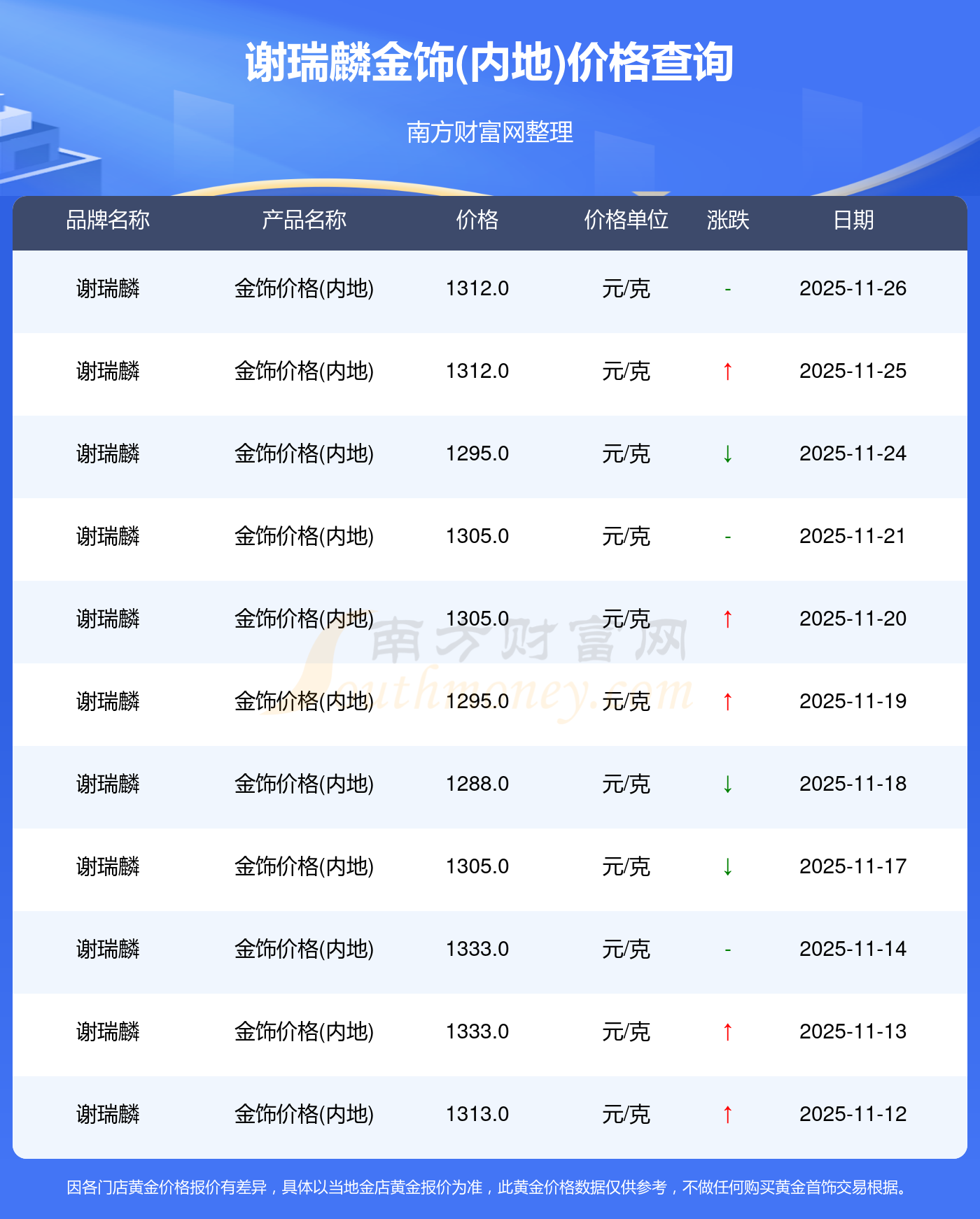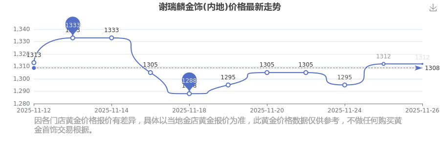 今日(2025年11月26日)謝瑞麟金飾價(jià)格(內(nèi)地)的價(jià)格為1312.0元/克。