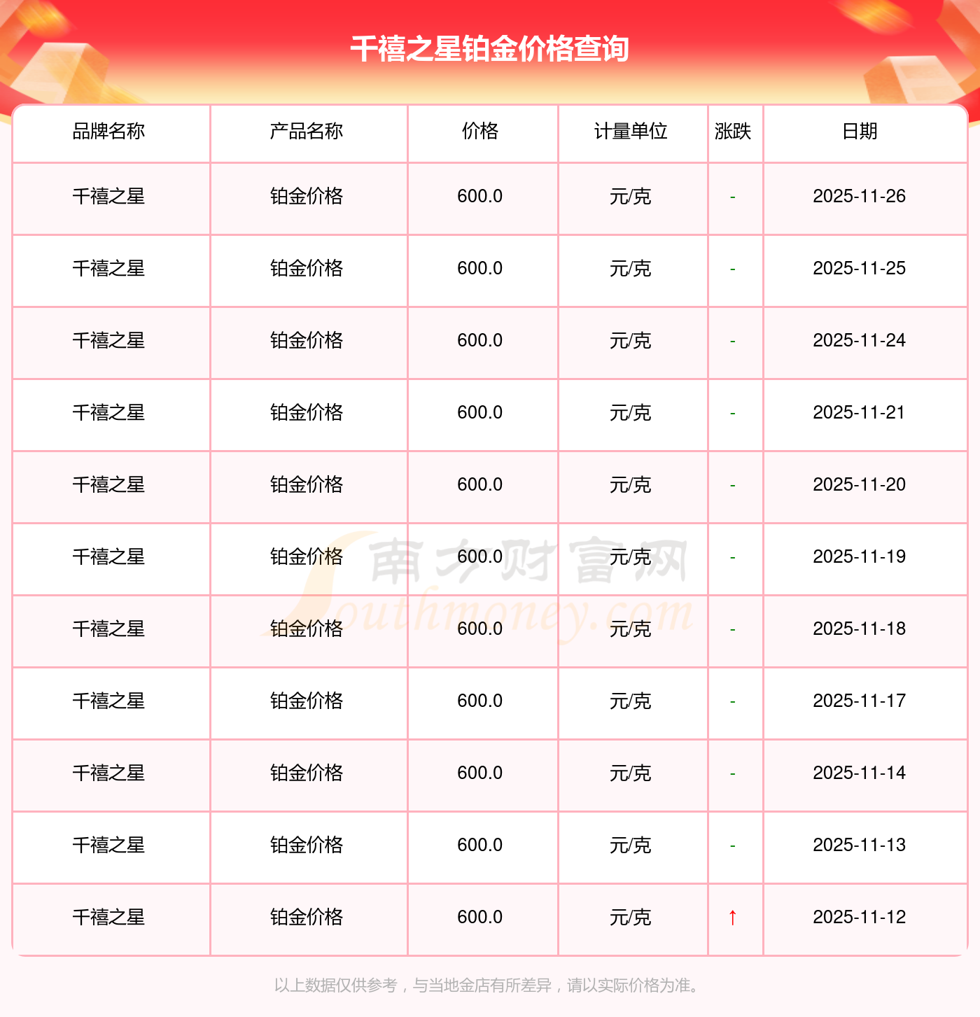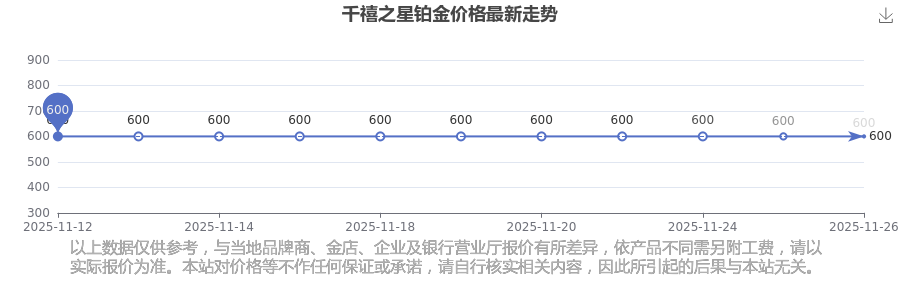 千禧之星 鉑金價格在今日的最新價格顯示為600.0元/克。