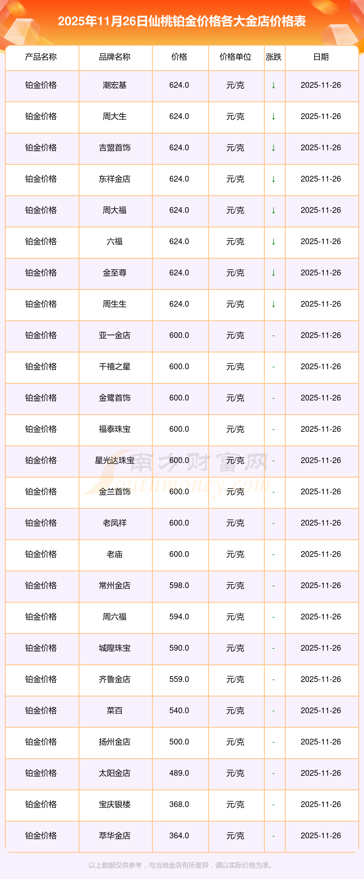 2025年11月26日仙桃各大金店鉑金價格最新價格:周生生1155.0元/克,潮宏基1312.0元/克,潮宏基624.0元/克,周大生1312.0元/克,周大生624.0元/克,亞一金店1315.0元/克,亞一金店600.0元/克,寶慶銀樓1258.0元/克,寶慶銀樓368.0元/克,太陽金店1149.0元/克,太陽金店489.0元/克。
