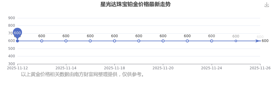 據(jù)了解,今日星光達珠寶 鉑金價格的最新價格為600.0元/克。