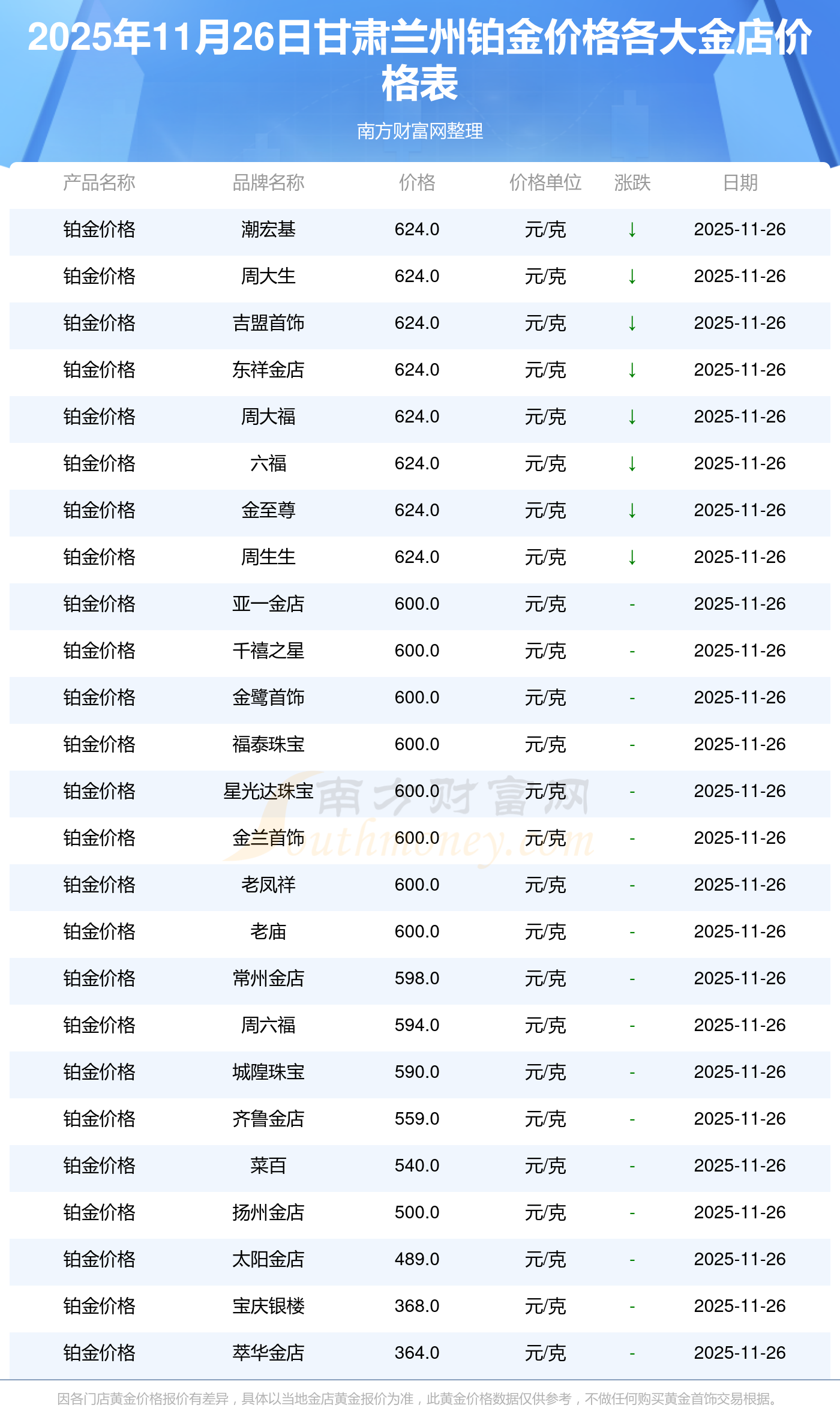 2025年11月26日甘肅蘭州各大金店鉑金價(jià)格最新價(jià)格查詢來了:周生生1155.0元/克,潮宏基1312.0元/克,潮宏基624.0元/克,周大生1312.0元/克,周大生624.0元/克,亞一金店1315.0元/克,亞一金店600.0元/克,寶慶銀樓1258.0元/克,寶慶銀樓368.0元/克,太陽(yáng)金店1149.0元/克,太陽(yáng)金店489.0元/克。