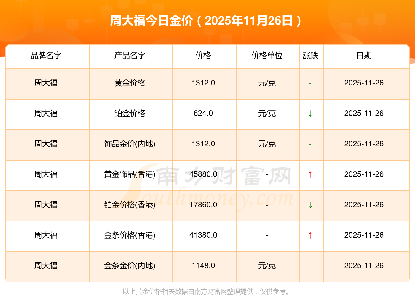 2025年11月26日周大福金價(jià)查詢:金條金價(jià)(內(nèi)地)1155.0元/克,黃金價(jià)格1312.0元/克,鉑金價(jià)格624.0元/克,黃金價(jià)格1312.0元/克,鉑金價(jià)格624.0元/克,黃金價(jià)格1315.0元/克,鉑金價(jià)格600.0元/克,黃金價(jià)格1258.0元/克,鉑金價(jià)格368.0元/克,黃金價(jià)格1149.0元/克,鉑金價(jià)格489.0元/克。