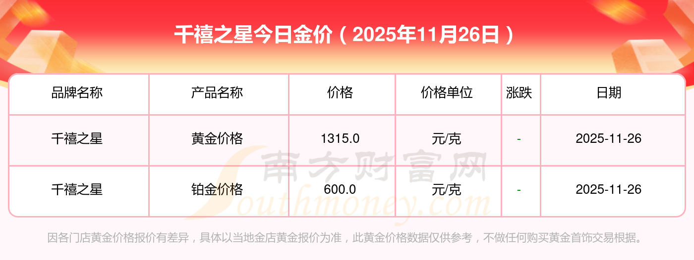 2025年11月26日千禧之星金價(jià)查詢:金條金價(jià)(內(nèi)地)1155.0元/克,黃金價(jià)格1312.0元/克,鉑金價(jià)格624.0元/克,黃金價(jià)格1312.0元/克,鉑金價(jià)格624.0元/克,黃金價(jià)格1315.0元/克,鉑金價(jià)格600.0元/克,黃金價(jià)格1258.0元/克,鉑金價(jià)格368.0元/克,黃金價(jià)格1149.0元/克,鉑金價(jià)格489.0元/克。