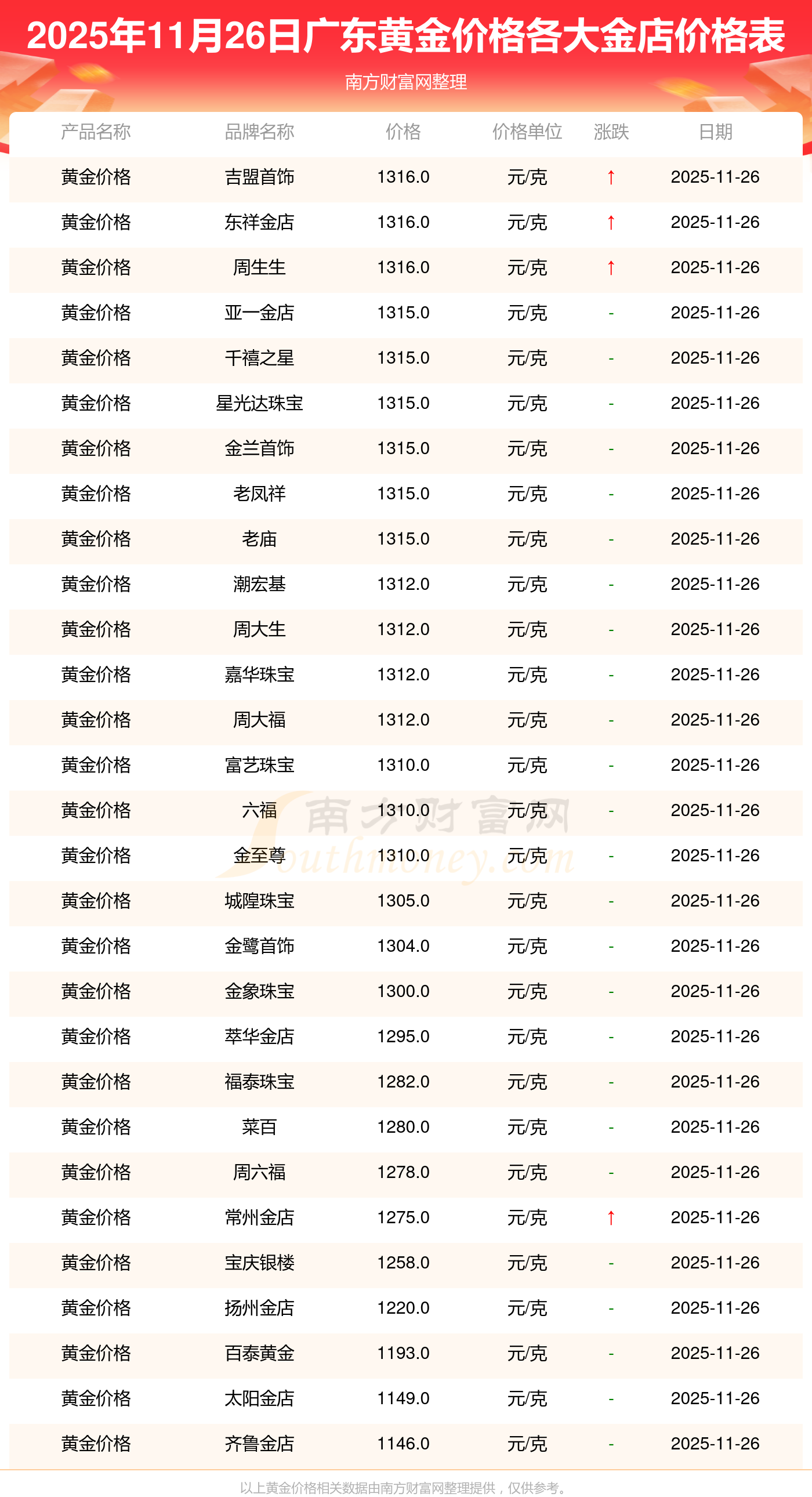 2025年11月26日廣東各大金店黃金價格最新價格查詢來了:周生生1155.0元/克,潮宏基1312.0元/克,潮宏基624.0元/克,周大生1312.0元/克,周大生624.0元/克,亞一金店1315.0元/克,亞一金店600.0元/克,寶慶銀樓1258.0元/克,寶慶銀樓368.0元/克,太陽金店1149.0元/克,太陽金店489.0元/克。