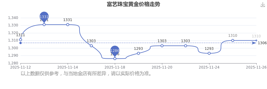 今日黃金價(jià)格查詢(xún)_現(xiàn)在金價(jià)黃金一克多少錢(qián),黃金價(jià)格是多少錢(qián)一克?黃金屬于優(yōu)良的導(dǎo)電導(dǎo)熱材料,有著良好的導(dǎo)熱特性。由于它化學(xué)穩(wěn)定性高、抗氧化性強(qiáng),能制作高精度電子元件,所以常被用于電子工業(yè)中的特殊電路設(shè)計(jì)。2025年11月26日富藝珠寶黃金價(jià)格為1310.0元/克。