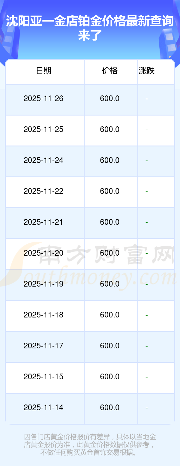今日(2025年11月26日),沈陽亞一金店鉑金價(jià)格的價(jià)格是600.0元/克。