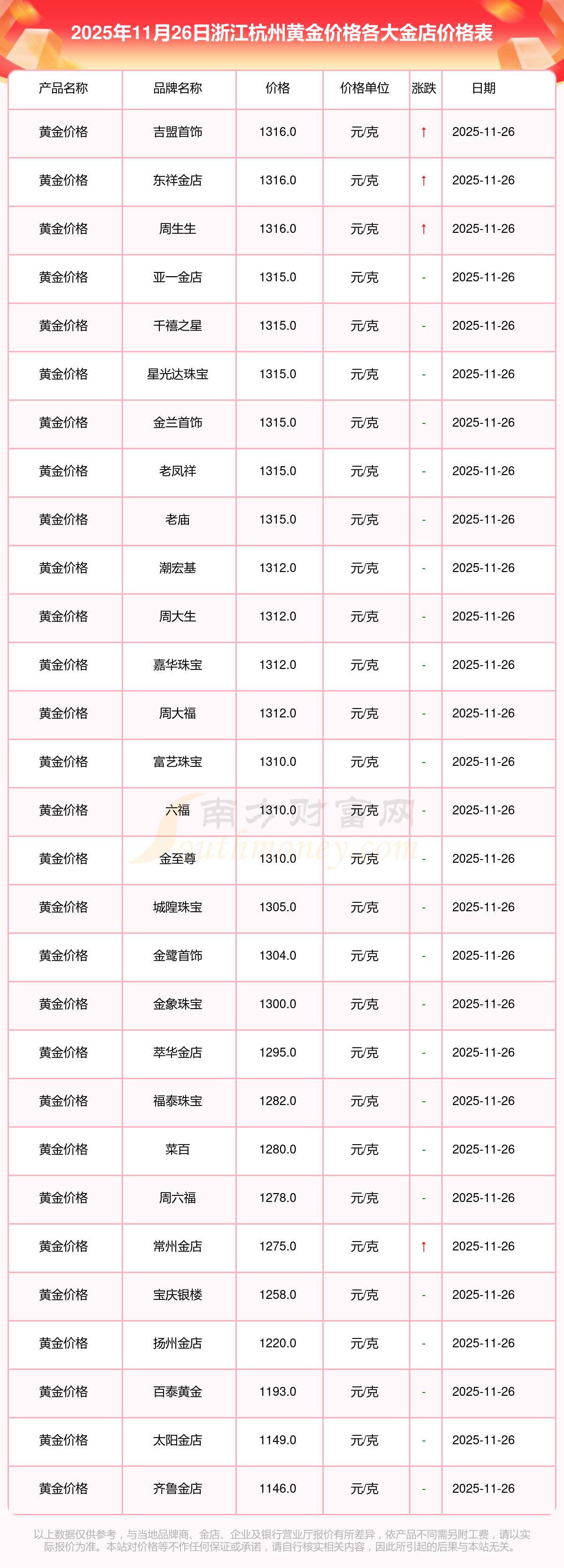 2025年11月26日,浙江杭州周生生、潮宏基、潮宏基、周大生、周大生、亞一金店、亞一金店、寶慶銀樓、寶慶銀樓、太陽金店、太陽金店等各大金店品牌黃金價(jià)格今日價(jià)格如下:周生生1155.0元/克、潮宏基1312.0元/克、潮宏基624.0元/克、周大生1312.0元/克、周大生624.0元/克、亞一金店1315.0元/克、亞一金店600.0元/克、寶慶銀樓1258.0元/克、寶慶銀樓368.0元/克、太陽金店1149.0元/克、太陽金店489.0元/克。