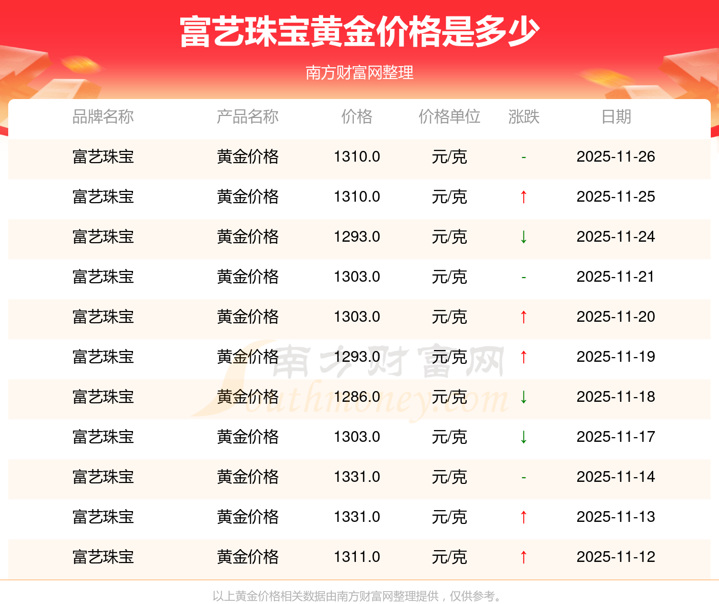 富藝珠寶今日 黃金價(jià)格的最新市場(chǎng)行情價(jià)為1310.0元/克。