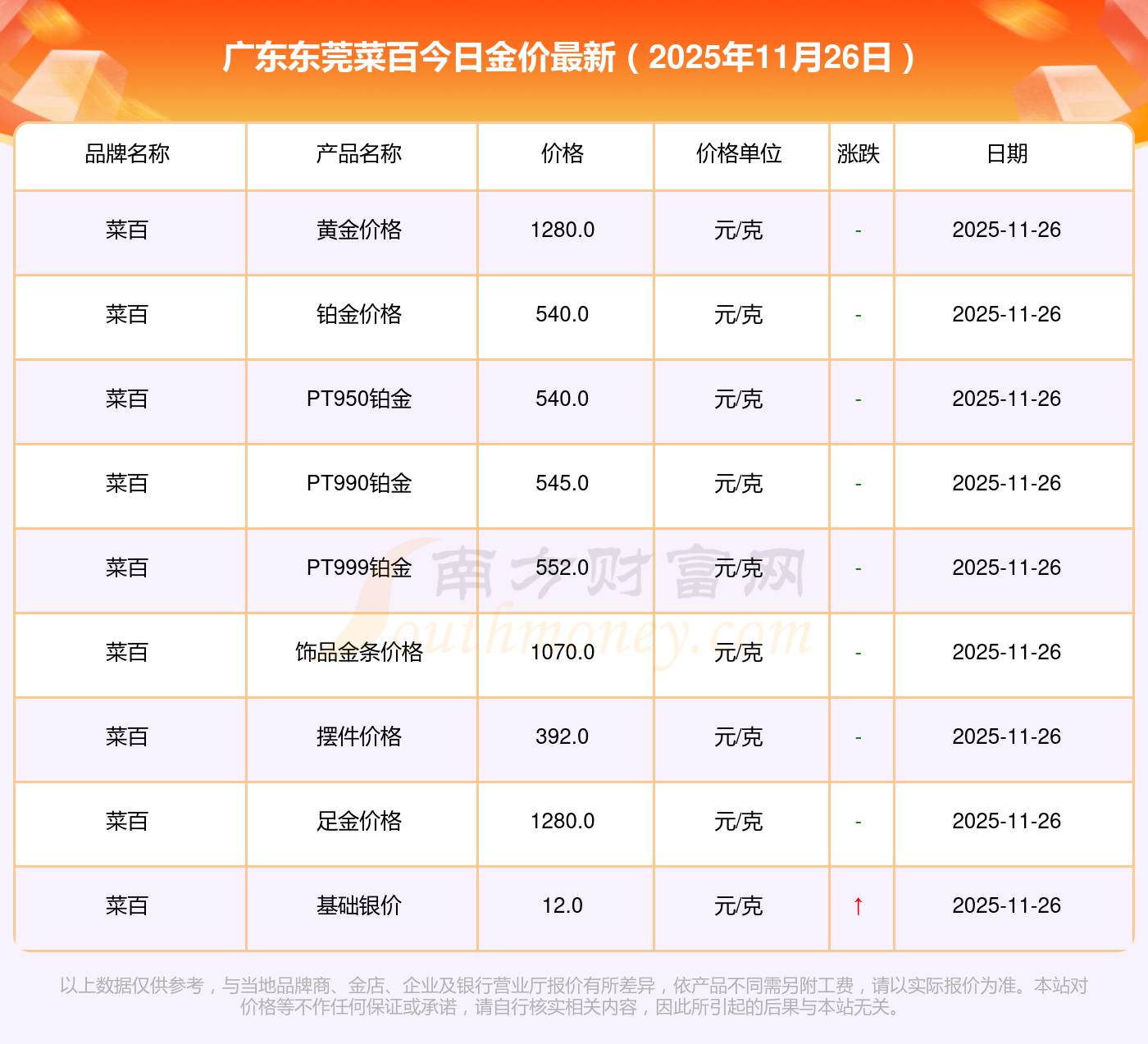 2025年11月26日廣東東莞菜百金價(jià)查詢:金條金價(jià)(內(nèi)地)1155.0元/克,黃金價(jià)格1312.0元/克,鉑金價(jià)格624.0元/克,黃金價(jià)格1312.0元/克,鉑金價(jià)格624.0元/克,黃金價(jià)格1315.0元/克,鉑金價(jià)格600.0元/克,黃金價(jià)格1258.0元/克,鉑金價(jià)格368.0元/克,黃金價(jià)格1149.0元/克,鉑金價(jià)格489.0元/克。