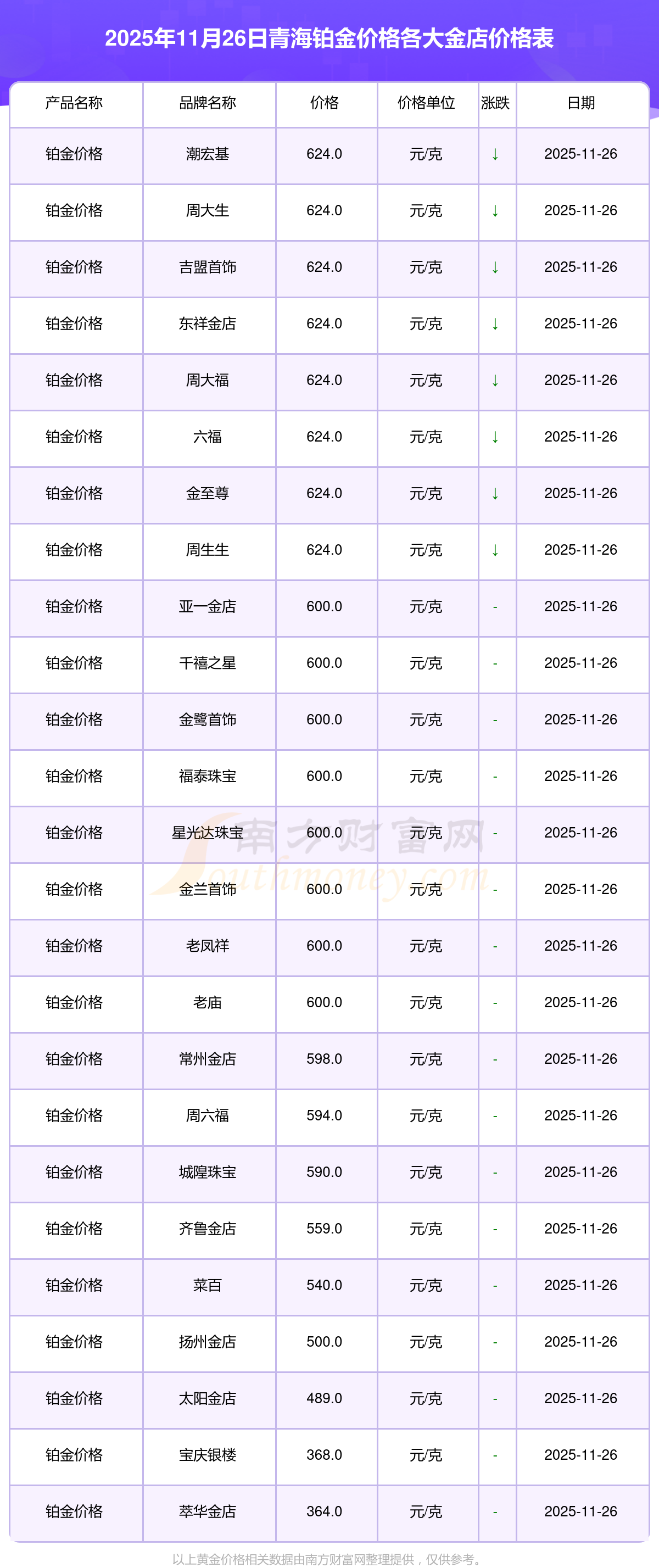 2025年11月26日,青海周生生、潮宏基、潮宏基、周大生、周大生、亞一金店、亞一金店、寶慶銀樓、寶慶銀樓、太陽金店、太陽金店等各大金店品牌鉑金價(jià)格今日價(jià)格如下:周生生1155.0元/克、潮宏基1312.0元/克、潮宏基624.0元/克、周大生1312.0元/克、周大生624.0元/克、亞一金店1315.0元/克、亞一金店600.0元/克、寶慶銀樓1258.0元/克、寶慶銀樓368.0元/克、太陽金店1149.0元/克、太陽金店489.0元/克。