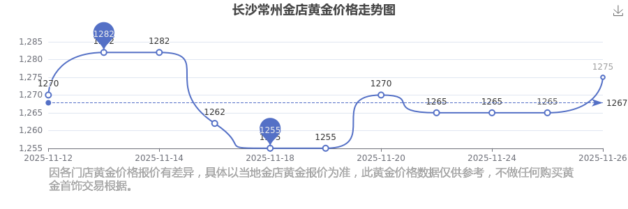 今日(2025年11月26日)長沙常州金店黃金價格為1275.0元/克。