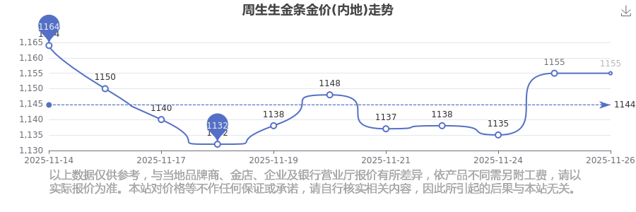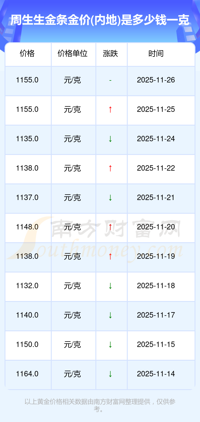 目前周生生 金條金價(jià)(內(nèi)地)的價(jià)格,今日最新為1155.0元/克。