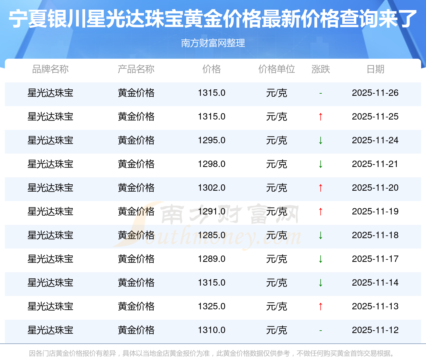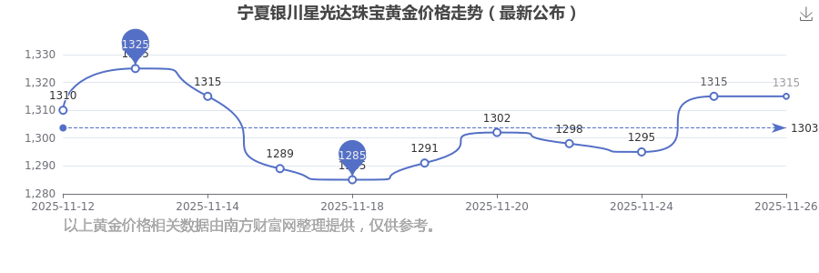 今日(2025年11月26日),1315.0元/克是寧夏銀川星光達珠寶黃金價格的價格標(biāo)準(zhǔn)。