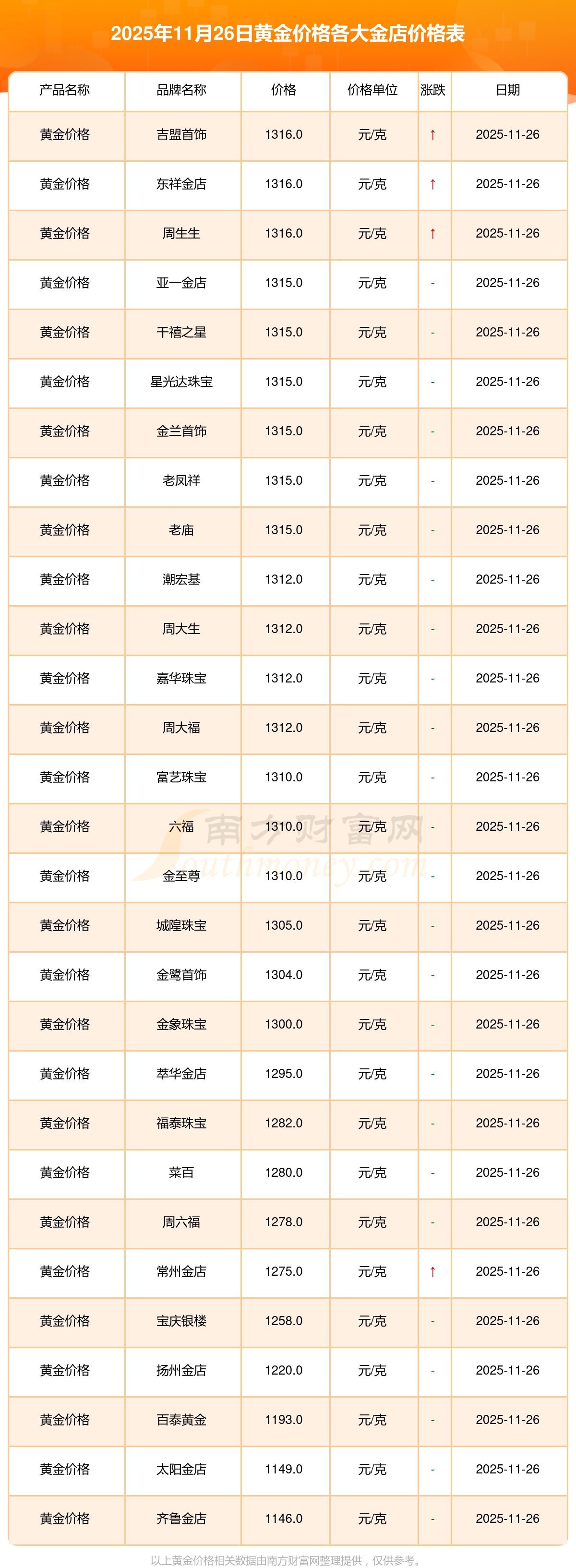 2025年11月26日各大金店黃金價格最新價格:周生生1155.0元/克,潮宏基1312.0元/克,潮宏基624.0元/克,周大生1312.0元/克,周大生624.0元/克,亞一金店1315.0元/克,亞一金店600.0元/克,寶慶銀樓1258.0元/克,寶慶銀樓368.0元/克,太陽金店1149.0元/克,太陽金店489.0元/克。