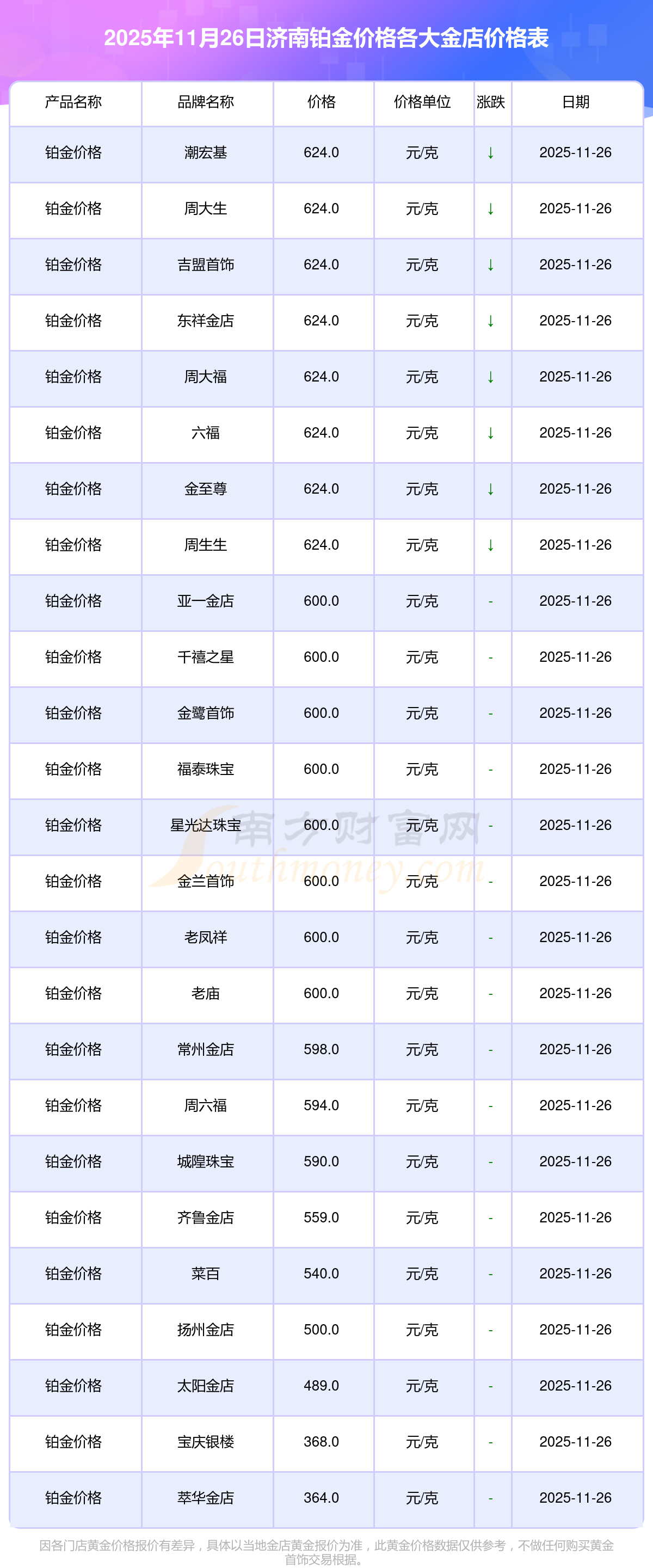 2025年11月26日,濟(jì)南周生生、潮宏基、潮宏基、周大生、周大生、亞一金店、亞一金店、寶慶銀樓、寶慶銀樓、太陽金店、太陽金店等各大金店品牌鉑金價格今日價格行情最新來了:周生生1155.0元/克、潮宏基1312.0元/克、潮宏基624.0元/克、周大生1312.0元/克、周大生624.0元/克、亞一金店1315.0元/克、亞一金店600.0元/克、寶慶銀樓1258.0元/克、寶慶銀樓368.0元/克、太陽金店1149.0元/克、太陽金店489.0元/克。