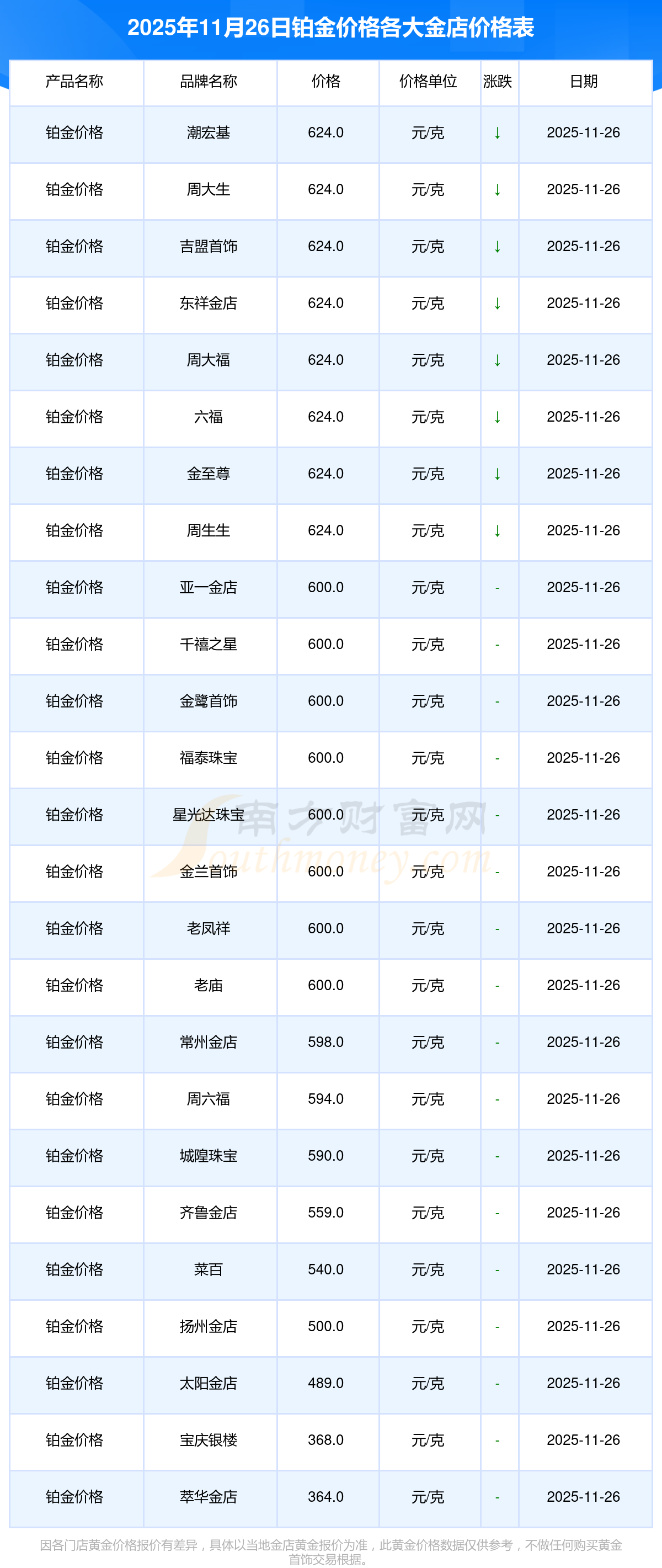 2025年11月26日各大金店鉑金價格最新價格:周生生1155.0元/克,潮宏基1312.0元/克,潮宏基624.0元/克,周大生1312.0元/克,周大生624.0元/克,亞一金店1315.0元/克,亞一金店600.0元/克,寶慶銀樓1258.0元/克,寶慶銀樓368.0元/克,太陽金店1149.0元/克,太陽金店489.0元/克。