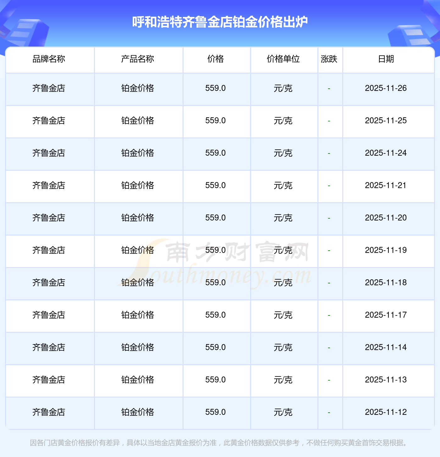 今日(2025年11月26日),呼和浩特齊魯金店鉑金價(jià)格:559.0元/克。