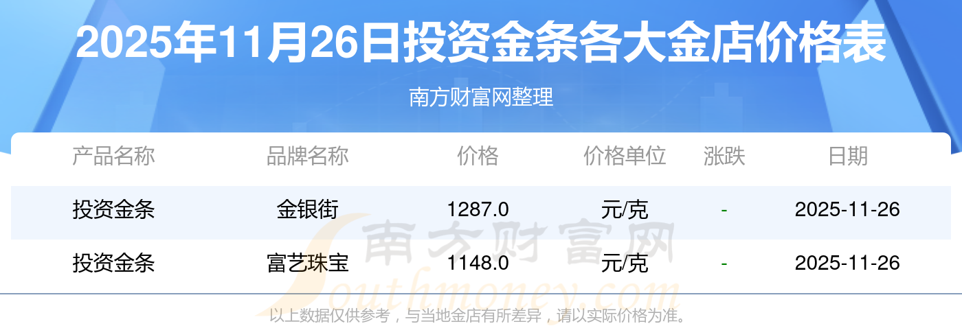 2025年11月26日各大金店投資金條價格多少一克?各大金店投資金條價格報價一覽表,一起來看看吧!
