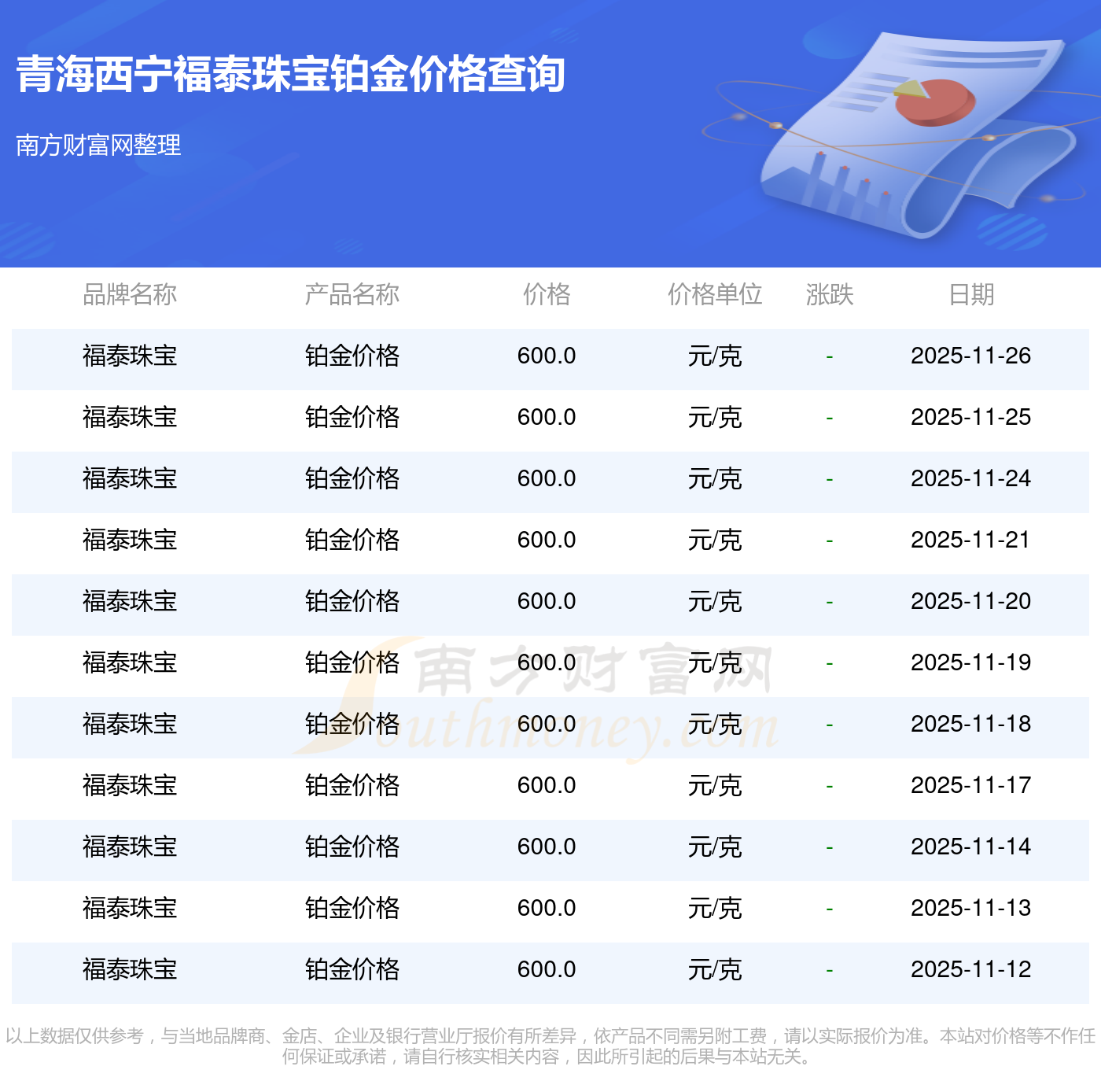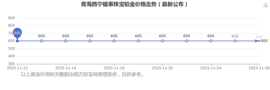 2025年11月26日這一天,青海西寧福泰珠寶的鉑金價格以 600.0元/克的價格售賣。