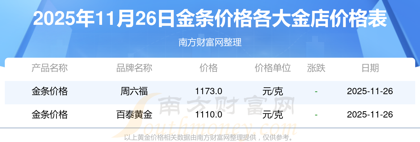2025年11月26日,周生生、潮宏基、潮宏基、周大生、周大生、亞一金店、亞一金店、寶慶銀樓、寶慶銀樓、太陽(yáng)金店、太陽(yáng)金店等各大金店品牌金條價(jià)格今日價(jià)格如下:周生生1155.0元/克、潮宏基1312.0元/克、潮宏基624.0元/克、周大生1312.0元/克、周大生624.0元/克、亞一金店1315.0元/克、亞一金店600.0元/克、寶慶銀樓1258.0元/克、寶慶銀樓368.0元/克、太陽(yáng)金店1149.0元/克、太陽(yáng)金店489.0元/克。