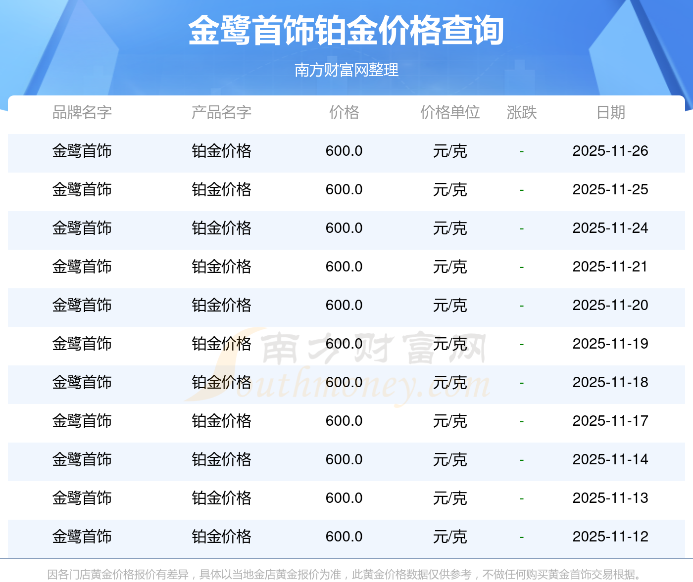 今日金鷺首飾 鉑金價格的最新定價為600.0元/克。