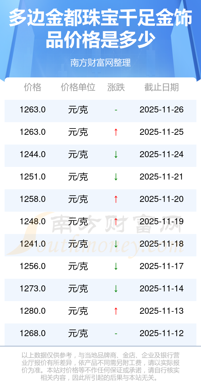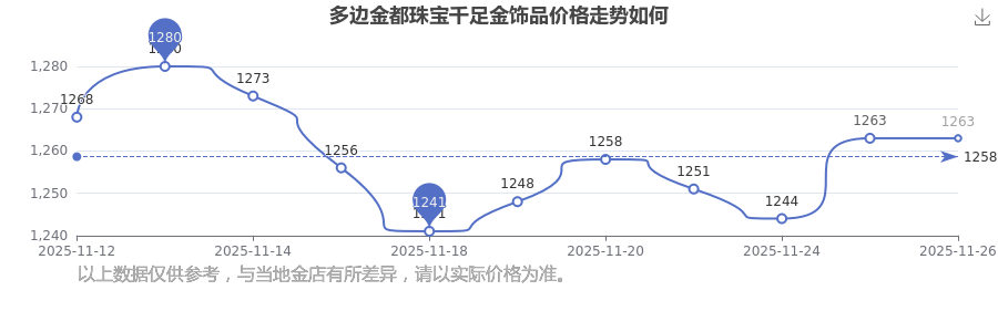 今日(2025年11月26日)多邊金都珠寶千足金飾品的價(jià)格為1263.0元/克。