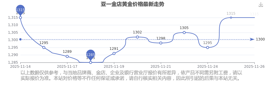 據(jù)了解,今日亞一金店 黃金價格的最新價格為1315.0元/克。