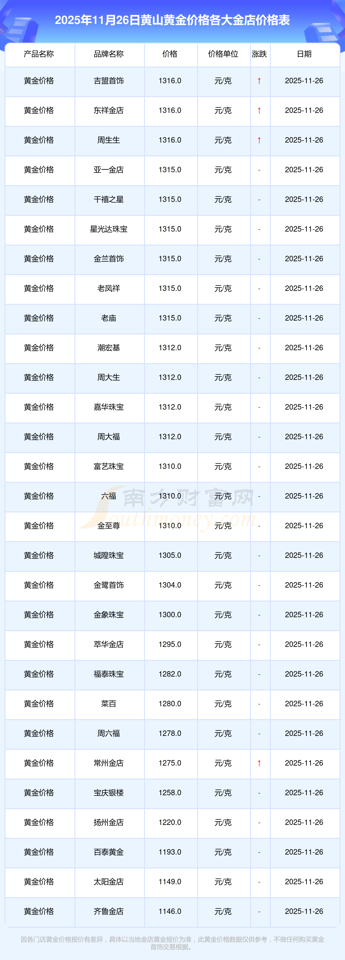 2025年11月26日,黃山周生生、潮宏基、潮宏基、周大生、周大生、亞一金店、亞一金店、寶慶銀樓、寶慶銀樓、太陽金店、太陽金店等各大金店品牌黃金價格今日價格行情最新來了:周生生1155.0元/克、潮宏基1312.0元/克、潮宏基624.0元/克、周大生1312.0元/克、周大生624.0元/克、亞一金店1315.0元/克、亞一金店600.0元/克、寶慶銀樓1258.0元/克、寶慶銀樓368.0元/克、太陽金店1149.0元/克、太陽金店489.0元/克。