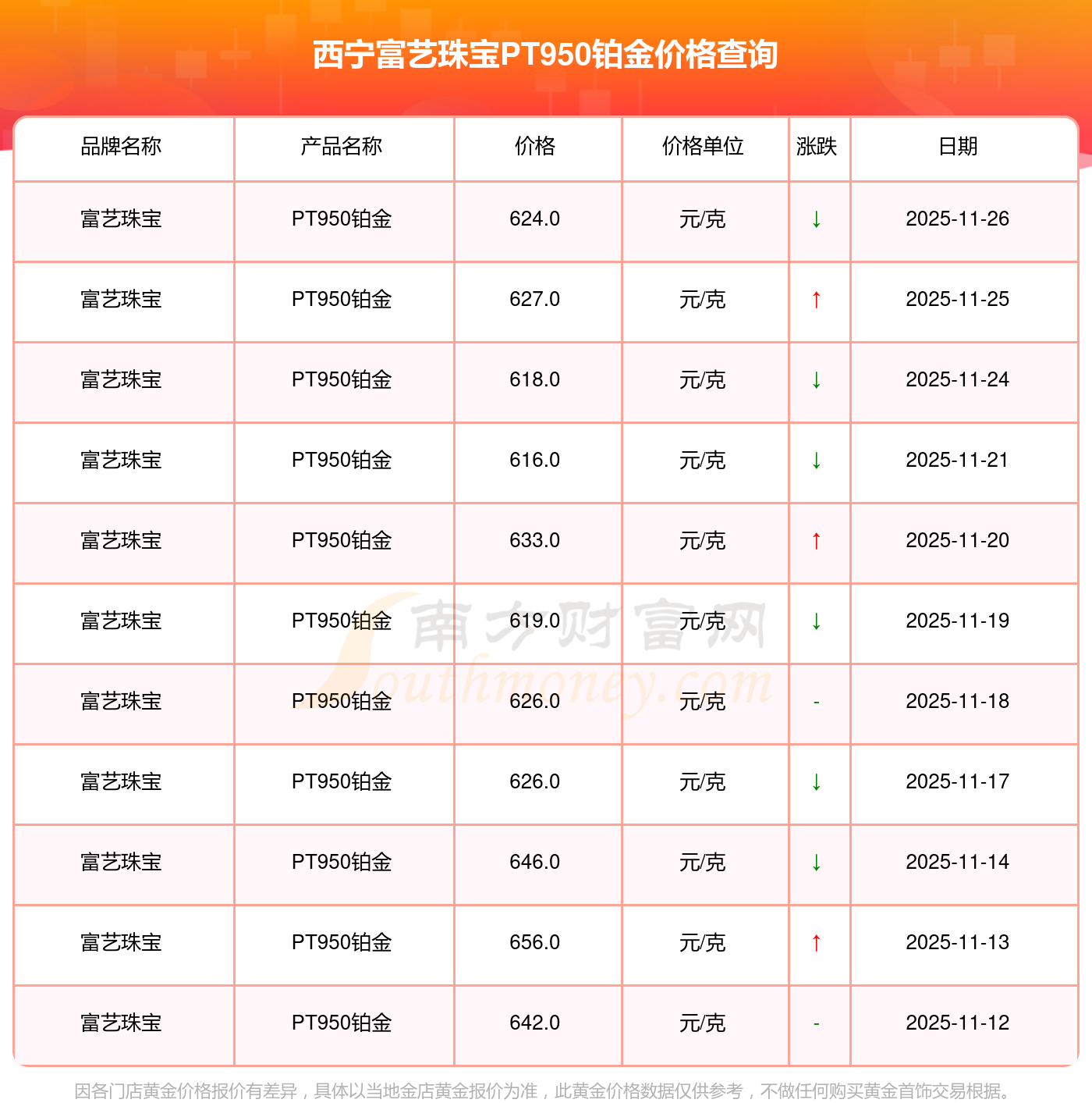 2025年11月26日各大金店P(guān)T950鉑金最新價格:周生生1155.0元/克,潮宏基1312.0元/克,潮宏基624.0元/克,周大生1312.0元/克,周大生624.0元/克,亞一金店1315.0元/克,亞一金店600.0元/克,寶慶銀樓1258.0元/克,寶慶銀樓368.0元/克,太陽金店1149.0元/克,太陽金店489.0元/克。