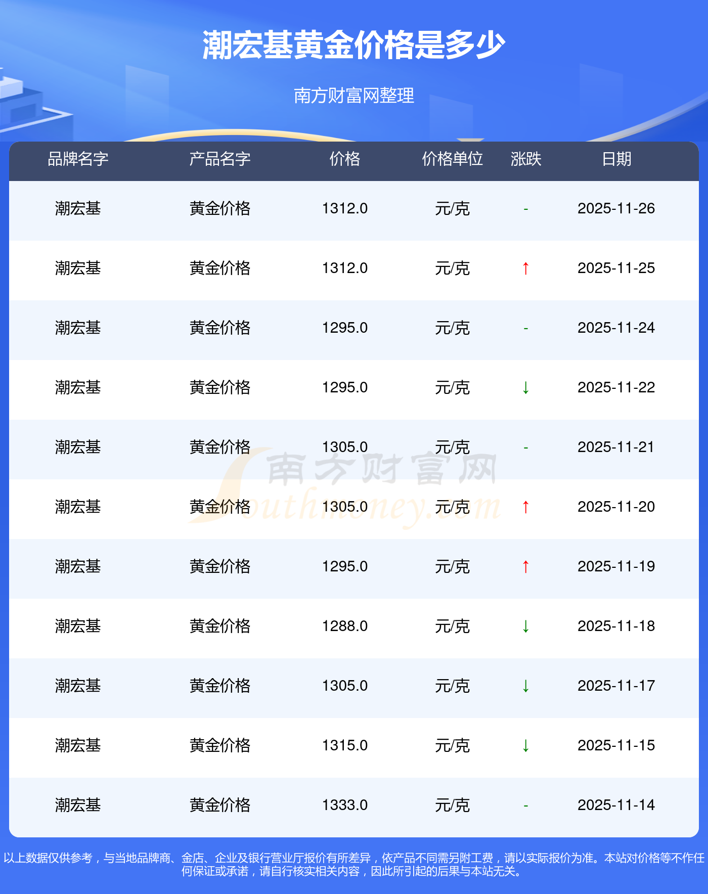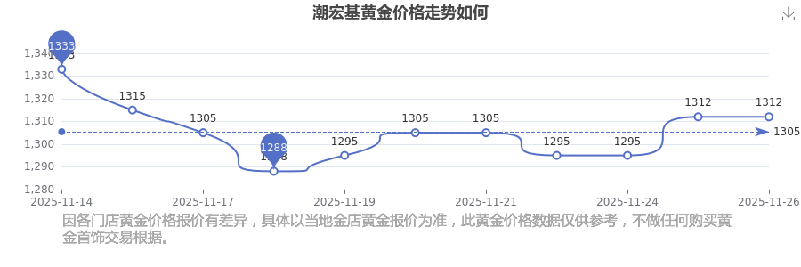 想查詢今天黃金價格,此刻黃金一克的價格是多少呀?一般情況下黃金每克的價位是多少左右?今日(2025年11月26日)潮宏基黃金價格的價格為1312.0元/克。