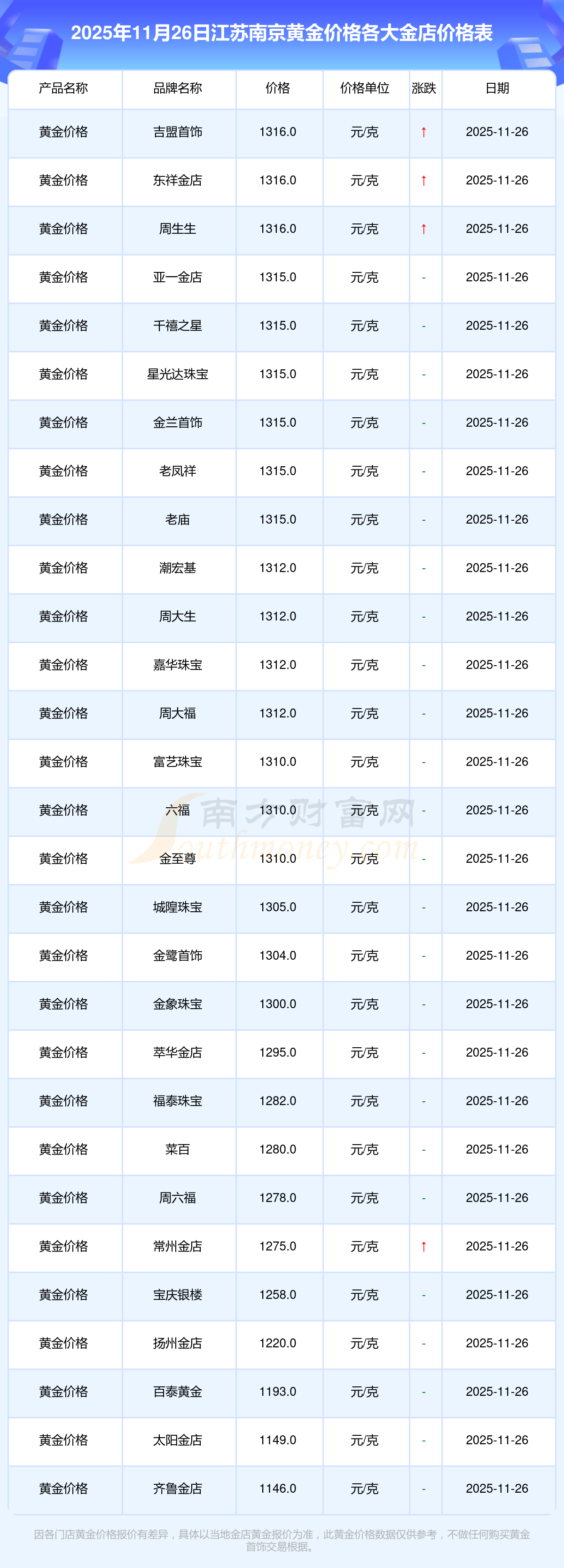 今天是2025年11月26日,江蘇南京周生生、潮宏基、潮宏基、周大生、周大生、亞一金店、亞一金店、寶慶銀樓、寶慶銀樓、太陽金店、太陽金店等各大金店品牌黃金價格最新價格行情是這樣的:周生生1155.0元/克、潮宏基1312.0元/克、潮宏基624.0元/克、周大生1312.0元/克、周大生624.0元/克、亞一金店1315.0元/克、亞一金店600.0元/克、寶慶銀樓1258.0元/克、寶慶銀樓368.0元/克、太陽金店1149.0元/克、太陽金店489.0元/克。